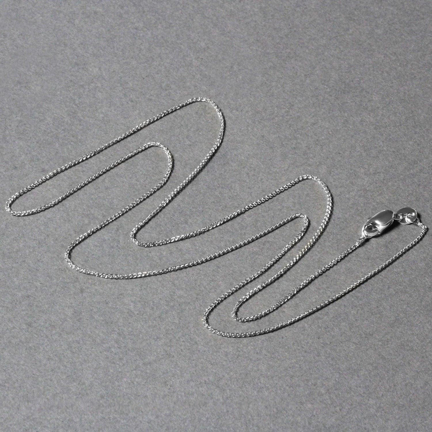 This round wheat chain comes in 14k white gold and has a width of 0.80 millimeters.