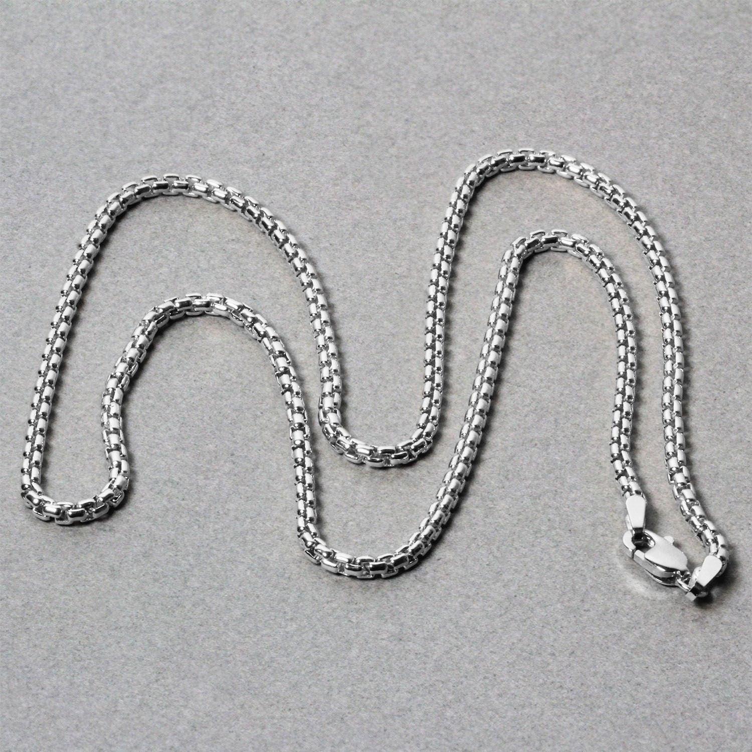This round box chain comes in 14k white gold and has a width of 2.5 millimeters.