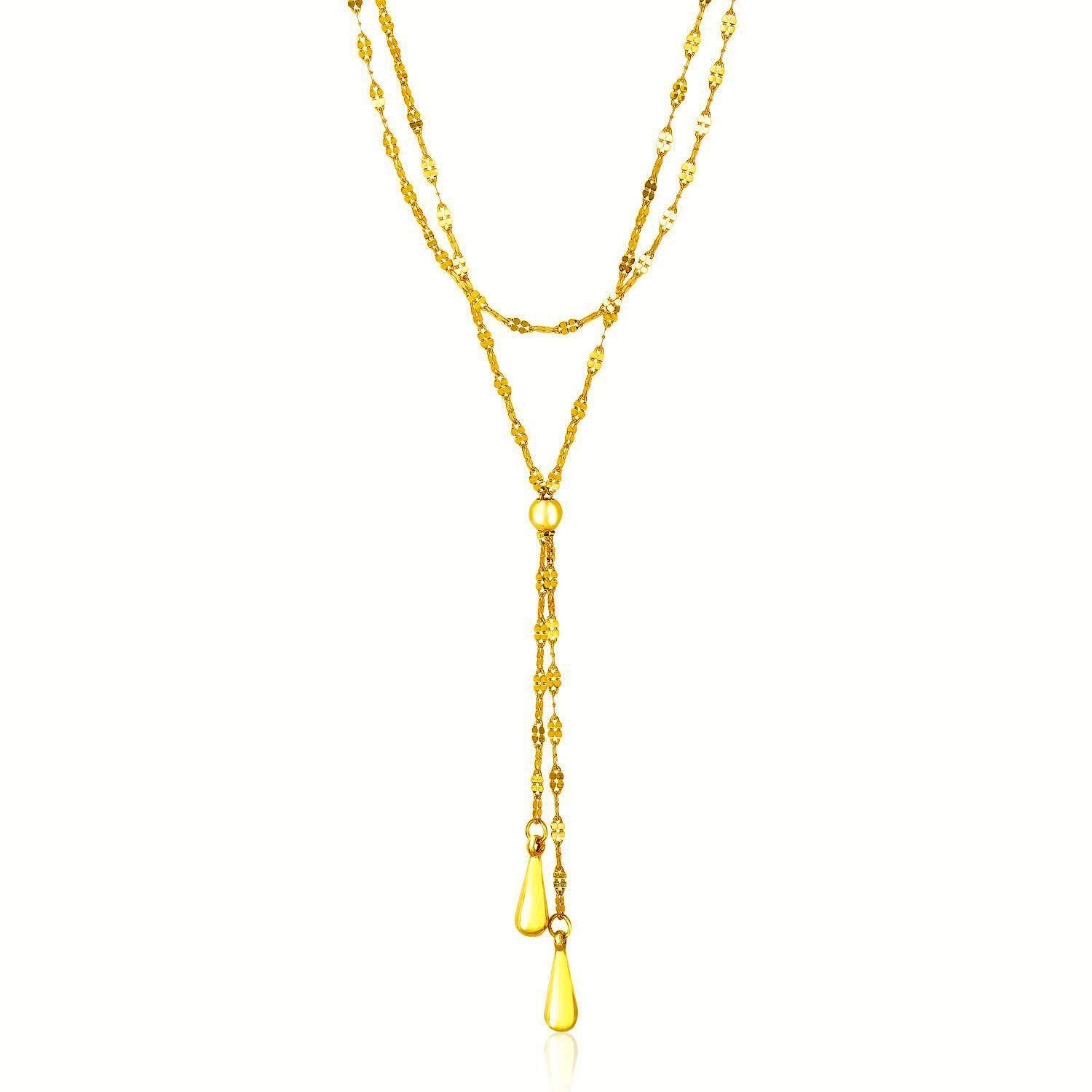 This showstopper of a double strand necklace features a chain with disc cluster sections. A lariat beauty with puffed teardrop elements, this 14k yellow gold piece comes in size 17 inches and is secured with a lobster closure.