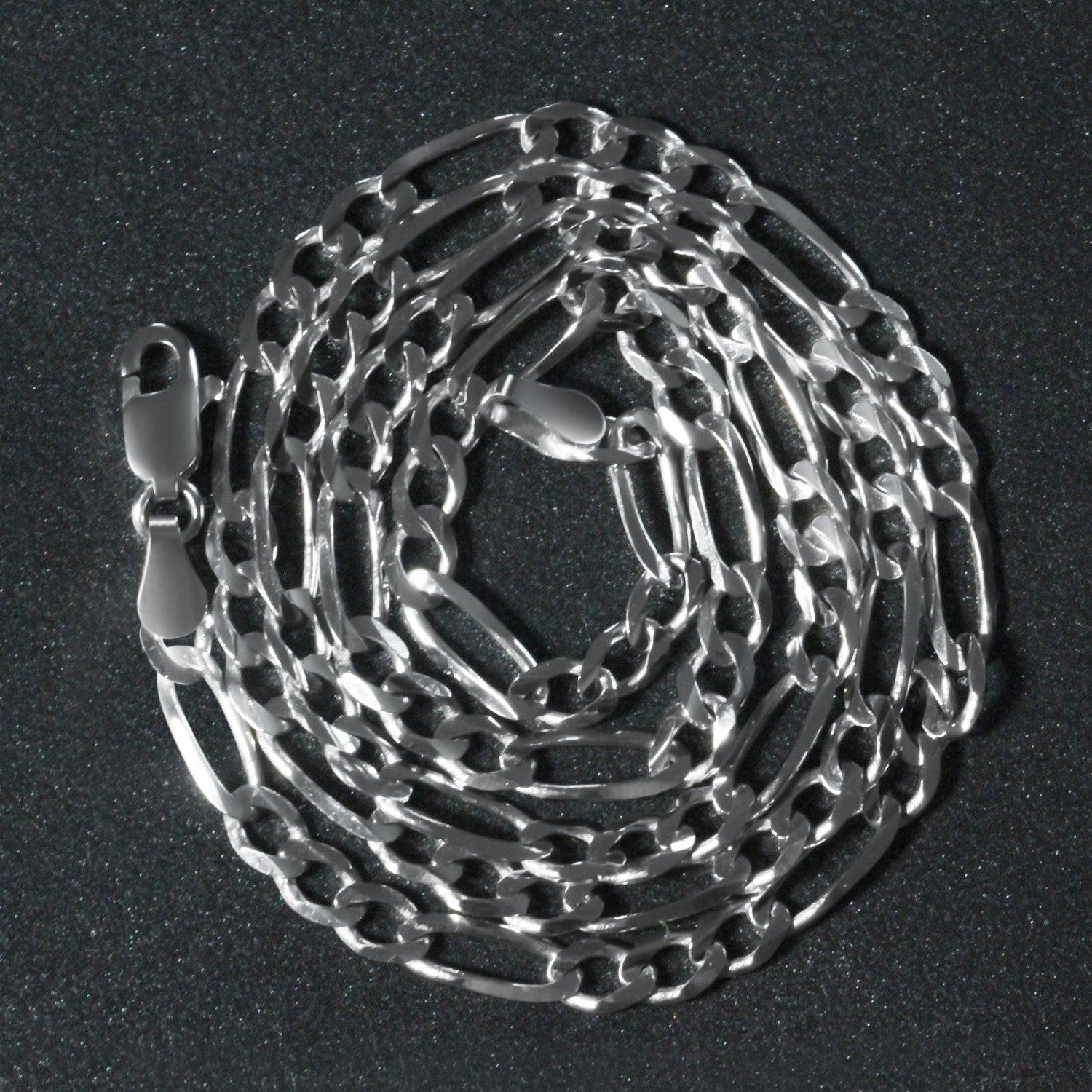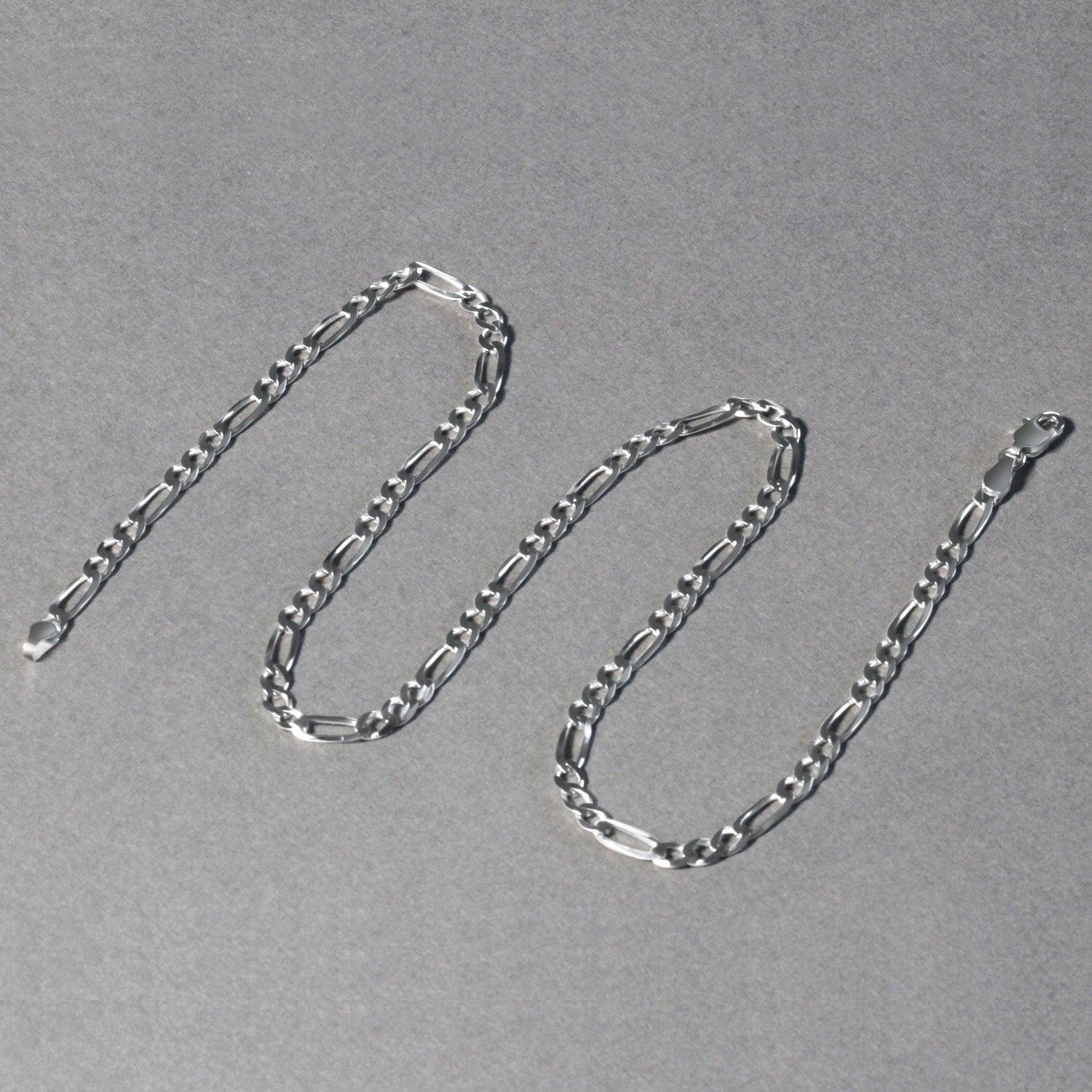This solid Figaro chain comes in 14k white gold and has a width of 3.80 millimeters.