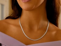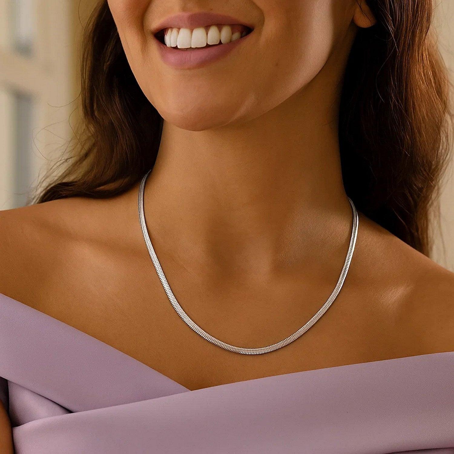 Crafted in sterling silver with a sleek rhodium finish, this 2.60 mm oval snake chain features smooth, elongated links that create a flexible, fluid drape and a bright, polished shine, making it a versatile accessory perfect for everyday wear or pairing with your favorite pendant.