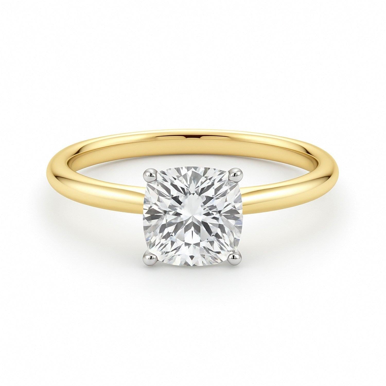 Celebrate life’s most meaningful moments with this exquisite 1 1/2 carat cushion-cut lab-grown diamond solitaire ring a flawless fusion of timeless elegance and modern sophistication. IGI certified with G color and VS1 clarity, the diamond radiates exceptional brilliance and premium quality you can trust. Set in a classic four-prong 14K white gold head and paired with a polished 14K yellow gold band, the elegant two-tone design offers a striking contrast that blends tradition with a contemporary touch. Perfect for proposals, anniversaries, or unforgettable milestones, this expertly crafted ring is meant to be treasured for a lifetime.