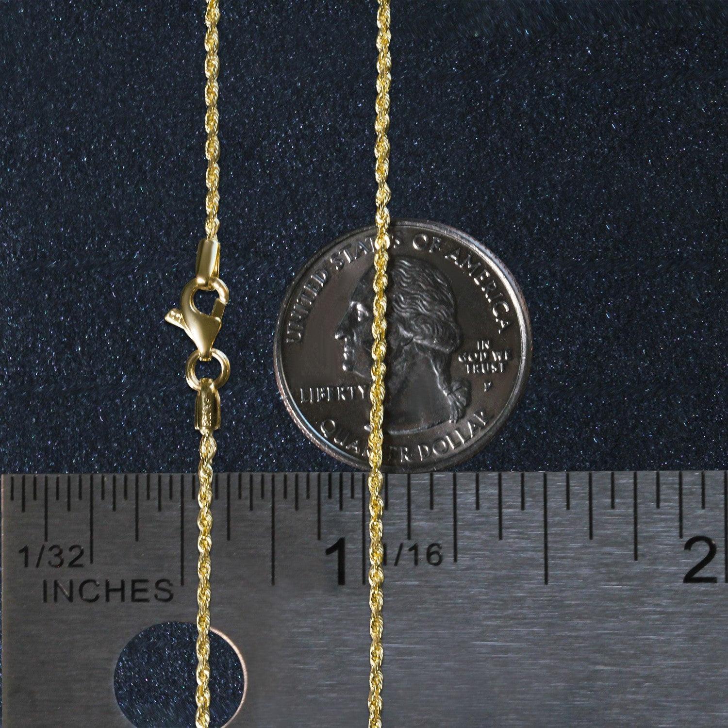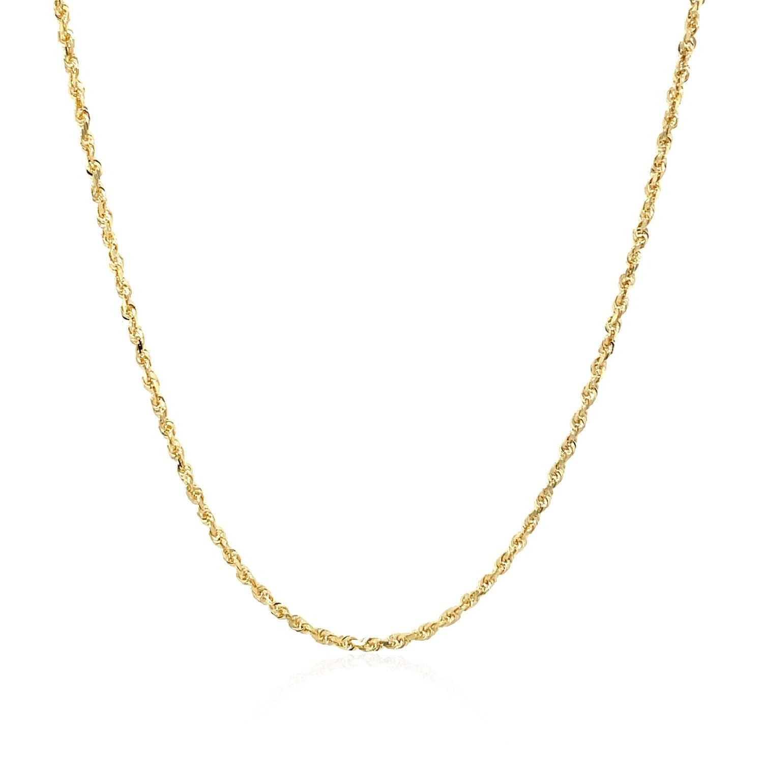 This solid diamond cut rope chain comes in 14k yellow gold and has a width of 1.4 millimeters.