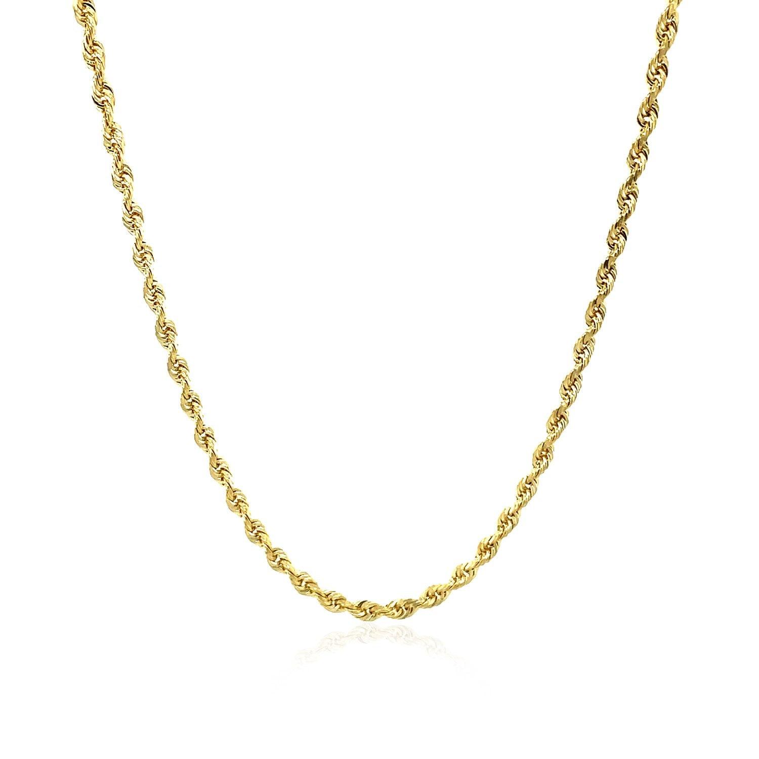 This solid diamond cut rope chain comes in 10k yellow gold and has a width of 2.5 millimeters.
