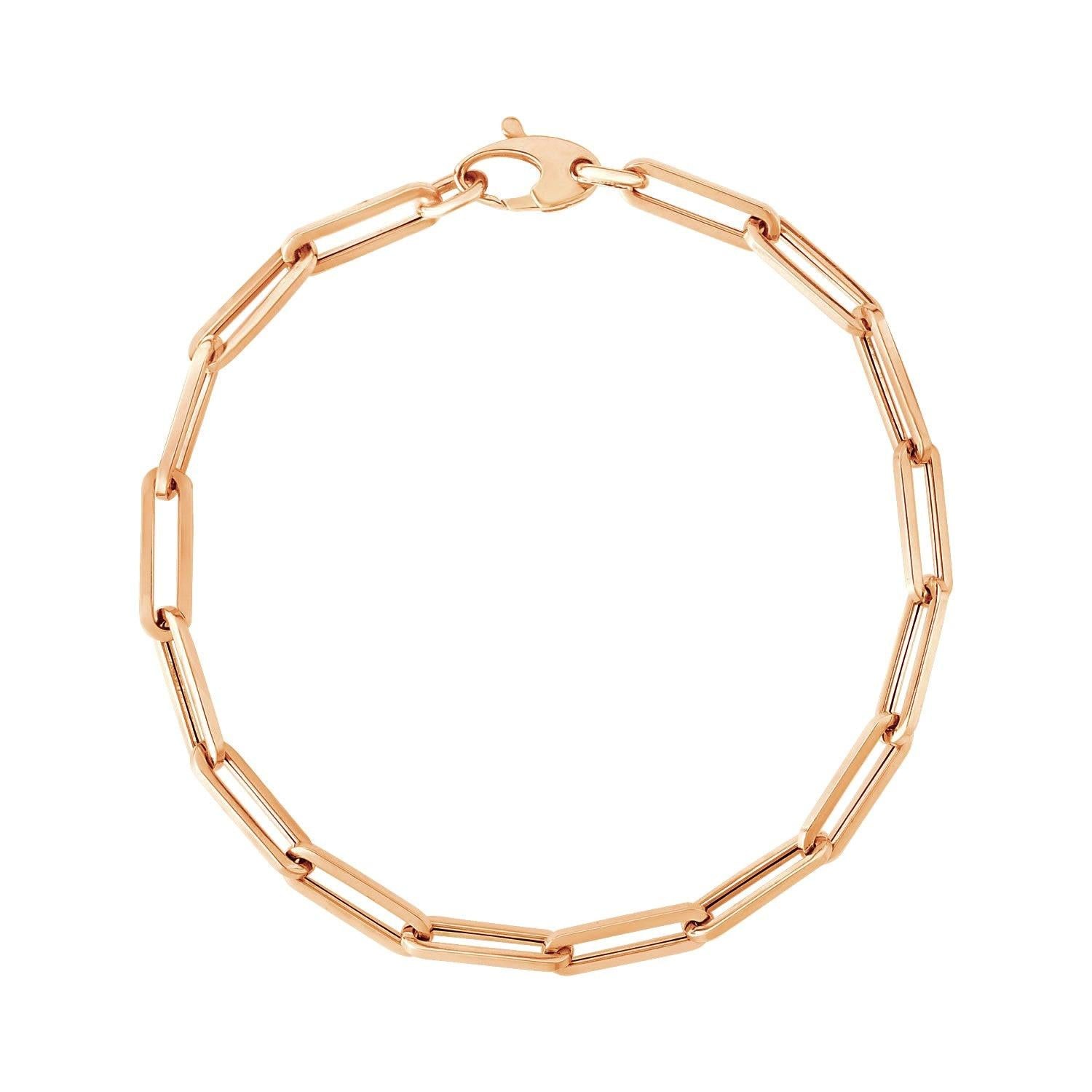 This simple yet dramatic bracelet combines the timeless shine of 14K rose gold and the modern geometry of paperclip chain links. Bracelet is 7 1/2 inches long, 4.2mm wide, and closes with a lobster clasp.