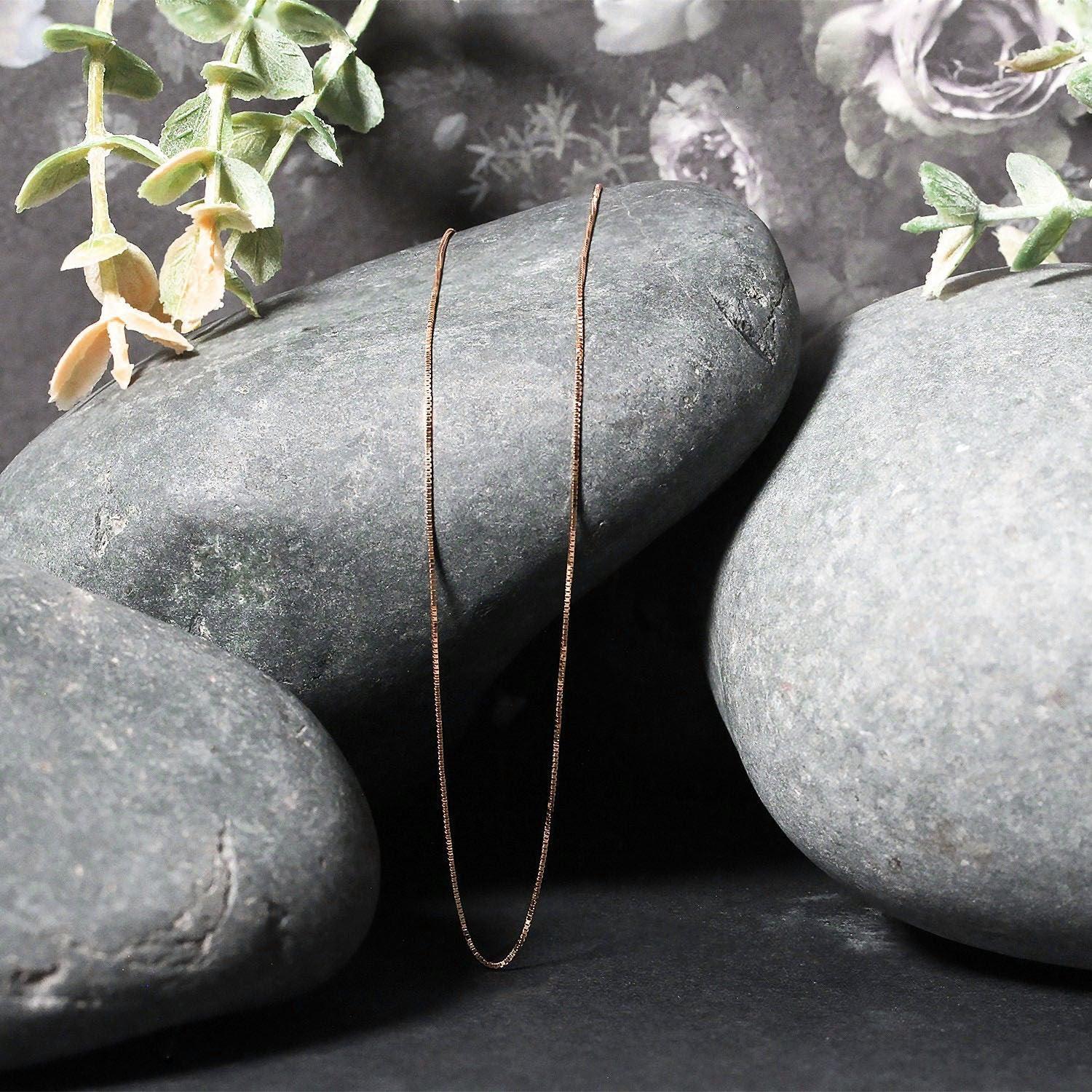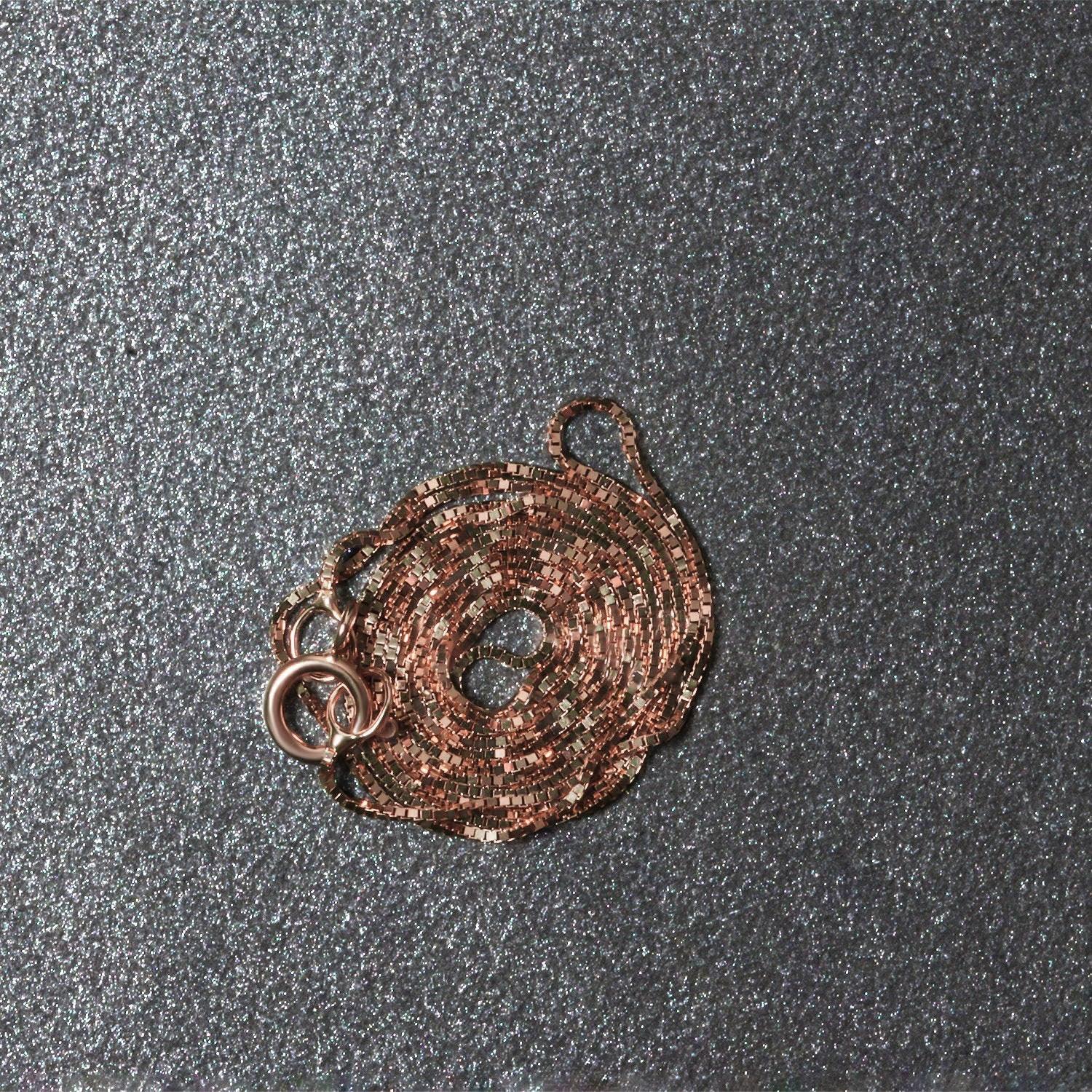 This classic box chain comes in 14k rose gold and has a width of 0.45 millimeters.