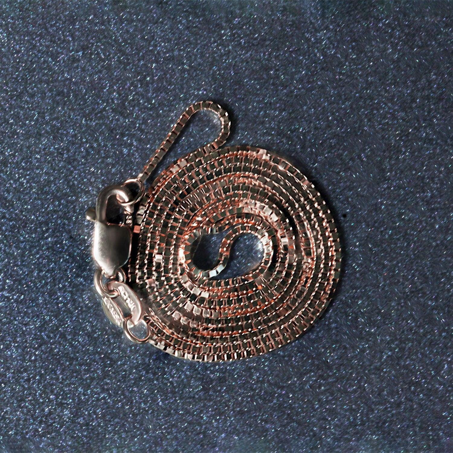 This classic box chain comes in 14k rose gold and has a width of 0.73 millimeters.