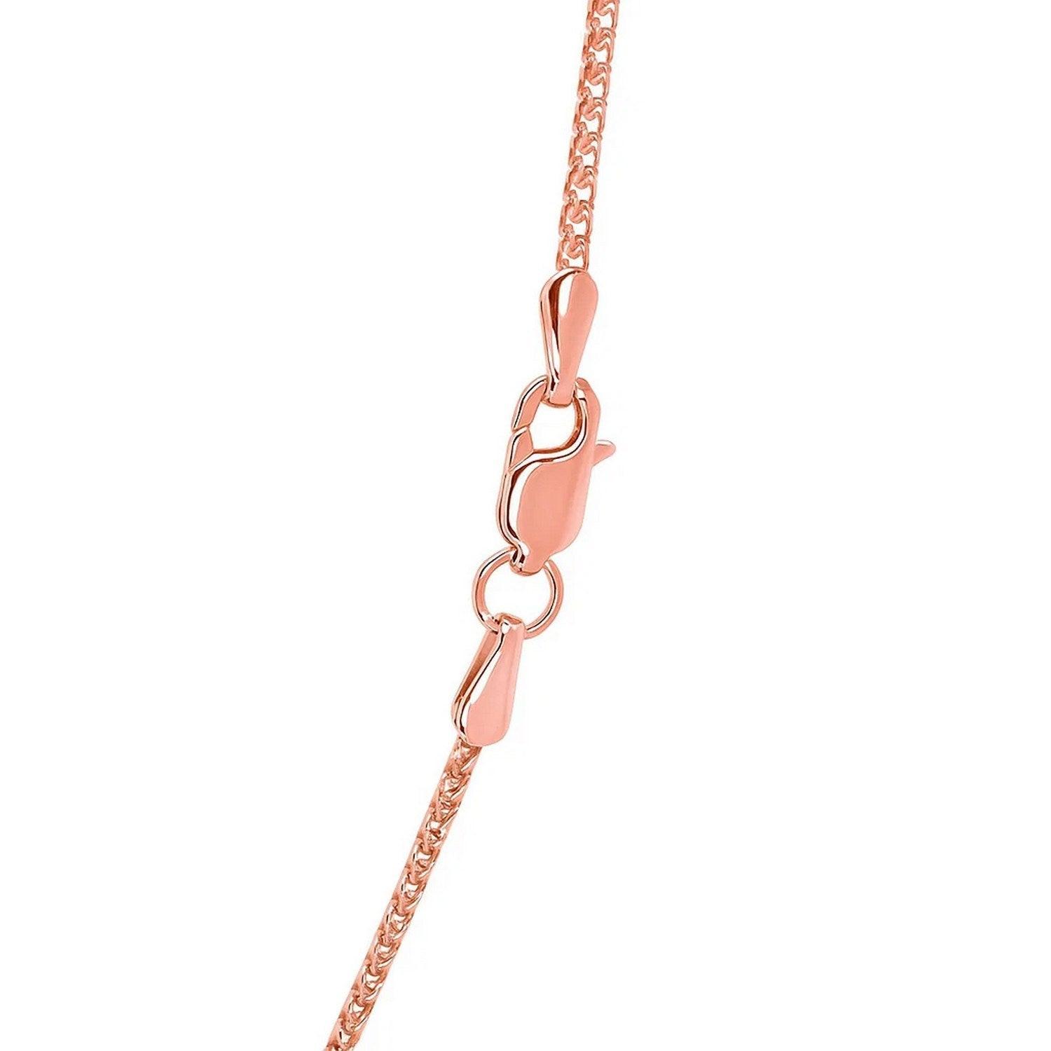 This diamond cut, round wheat chain comes in 14k rose gold and has a width of 1.20 millimeters.