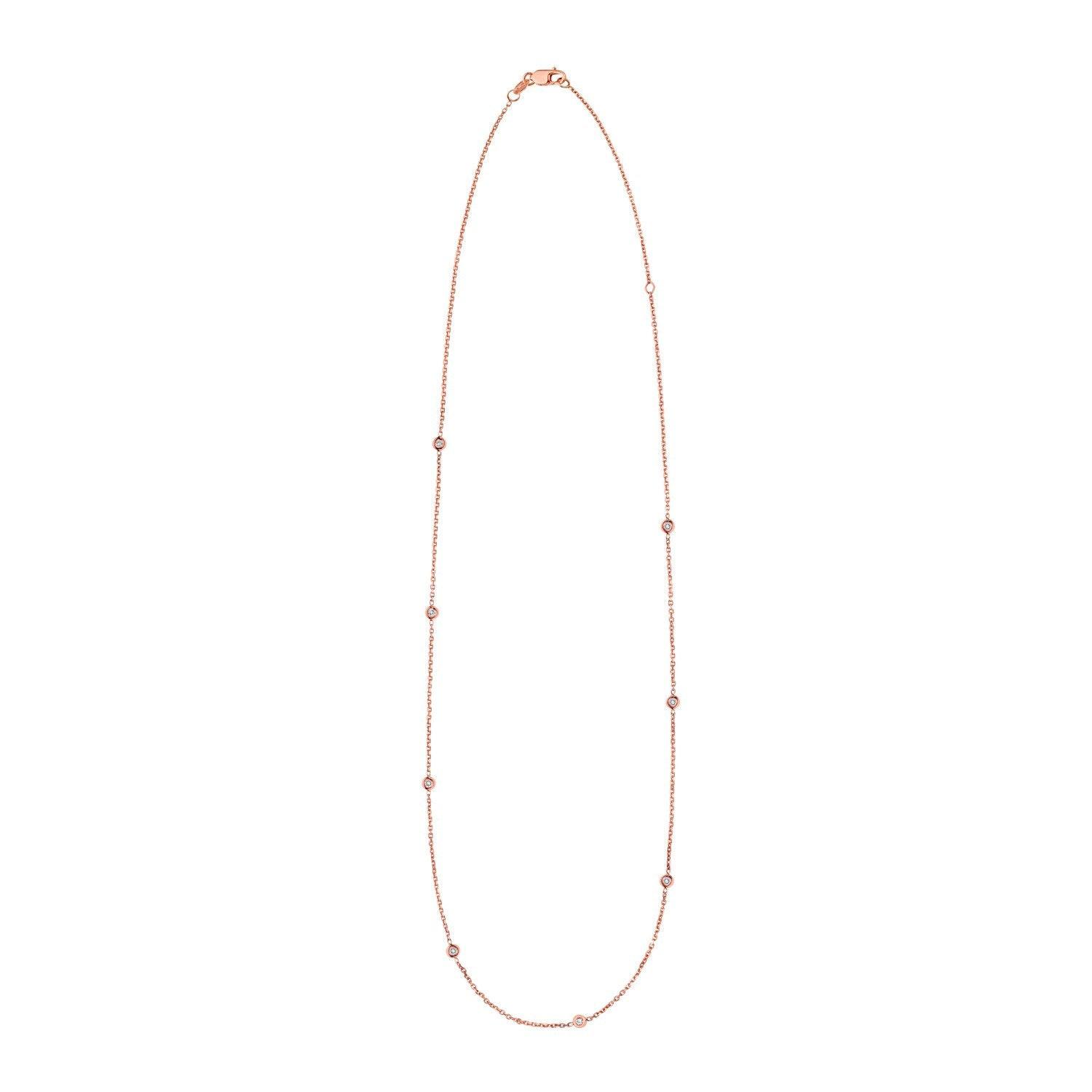 This 14K rose gold Diamonds by the Yard necklace features bezel-set diamonds spaced along a delicate gold chain, creating a timeless, light-catching look. Elegant and versatile, it’s perfect for everyday wear, layering, or adding a touch of sparkle to any outfit.