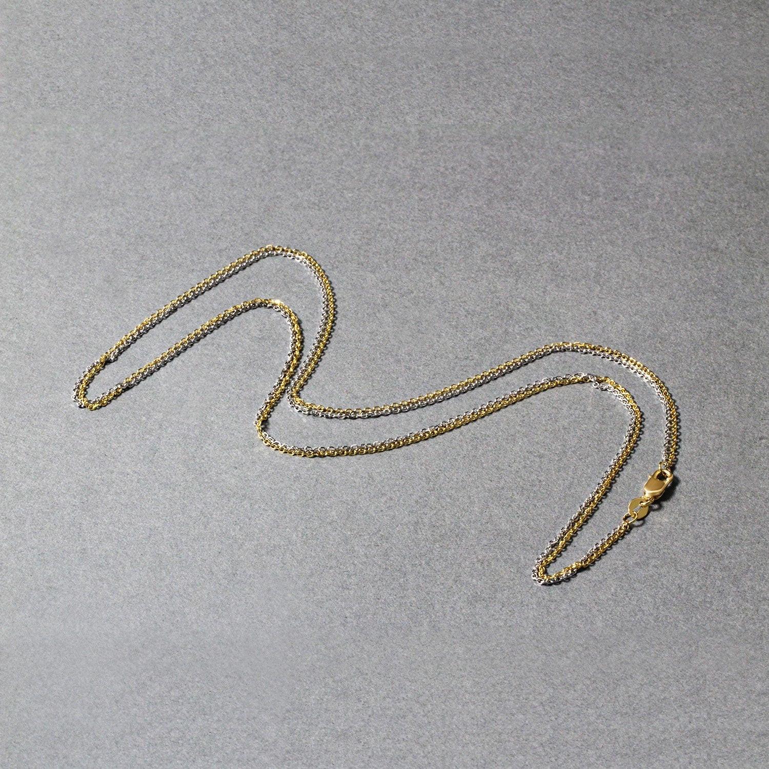 This double strand cable pendant chain is crafted in 14k two-tone gold, and each strand measures a width of 1.1 millimeters. The chain is fastened securely with a lobster clasp.