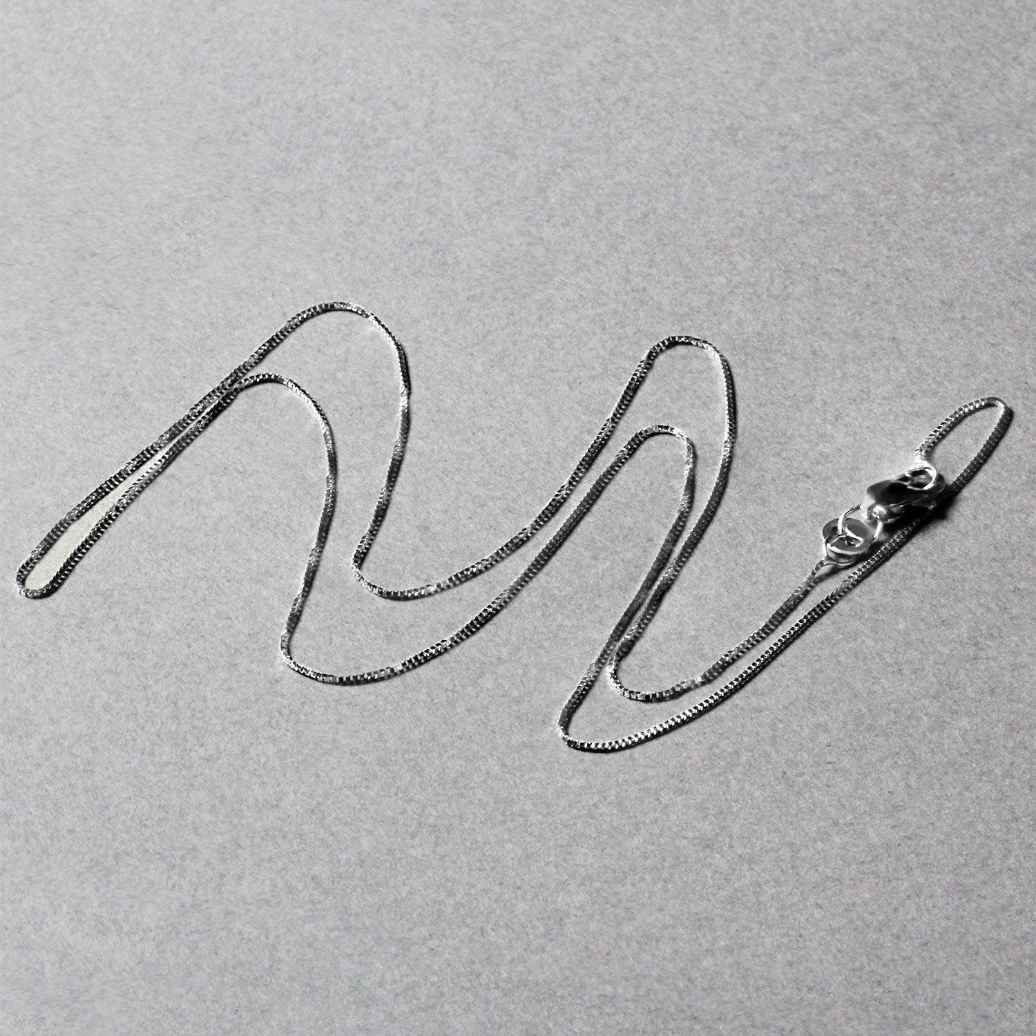 This classic box chain comes in 14k white gold and has a width of 0.45 millimeters.