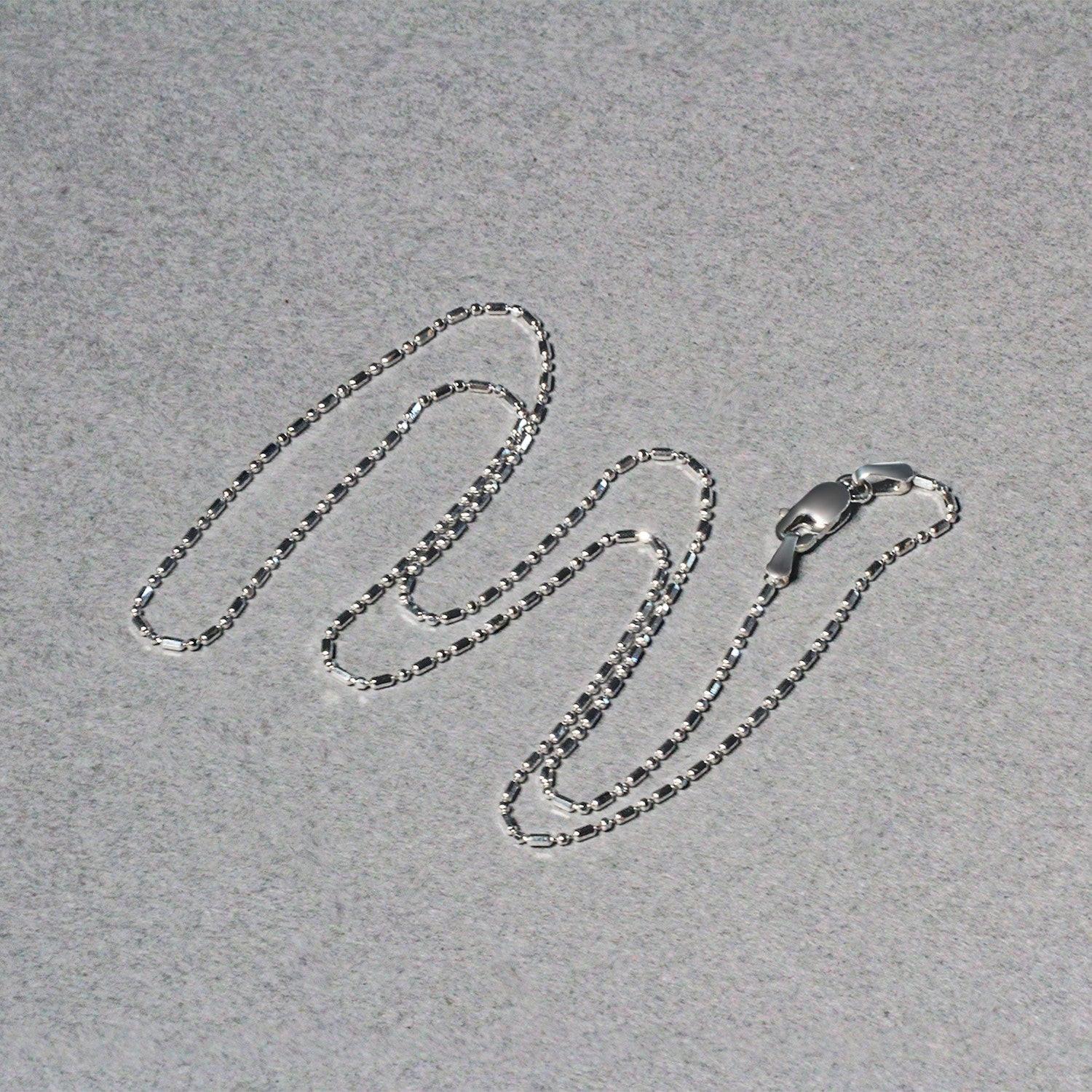 This diamond cut bead chain comes in 14k white gold and has a width of 0.90 millimeters.