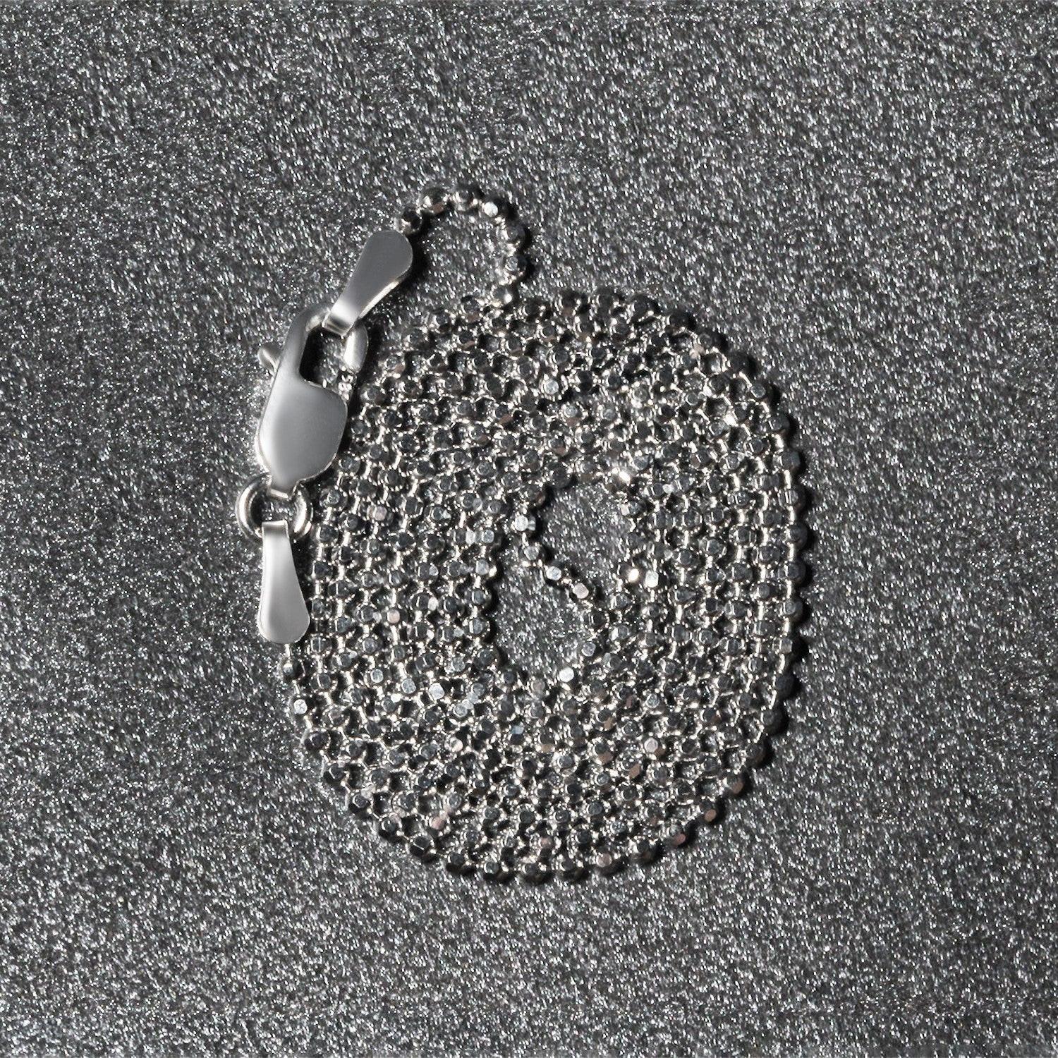 This diamond cut bead chain comes in 14k white gold and has a width of 1.10 millimeters.