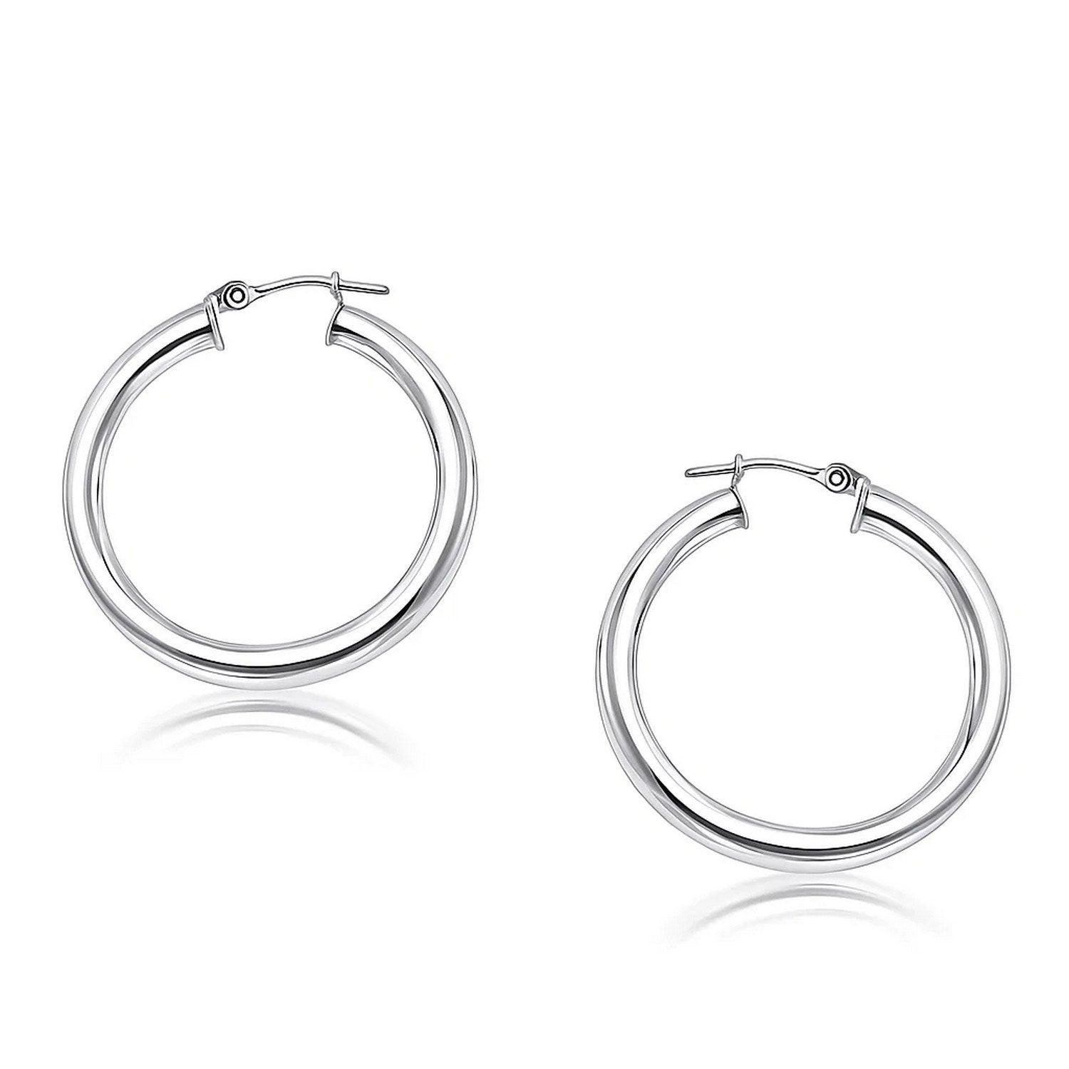 These timeless hoop earrings are crafted in 14k white gold and measure 30 millimeters in diameter, featuring a snap lock backing.