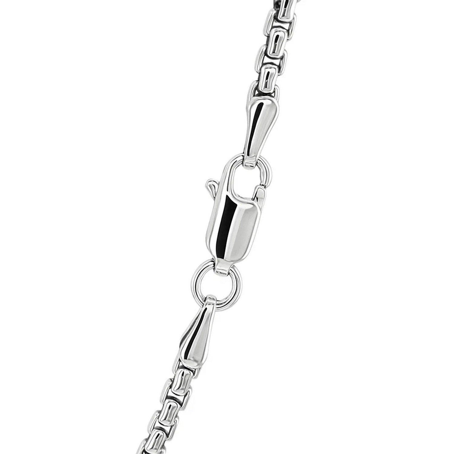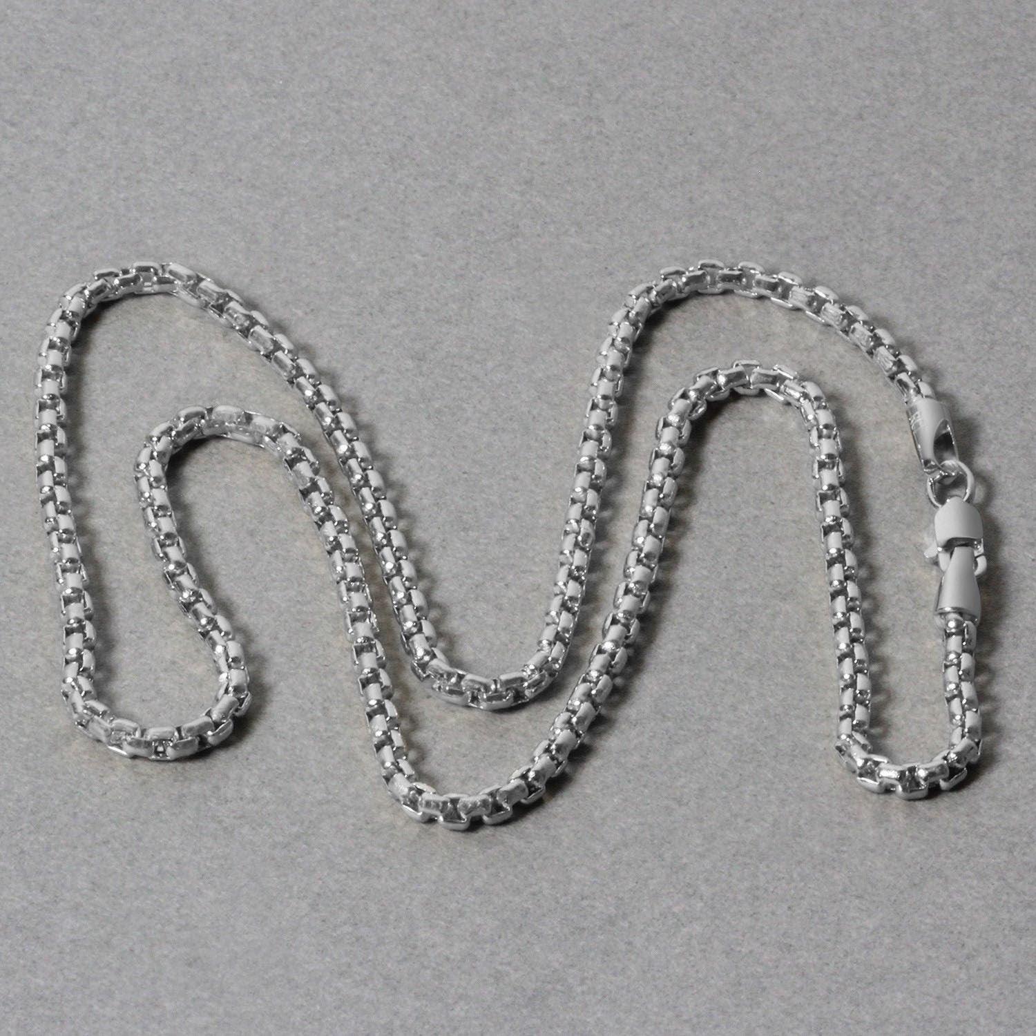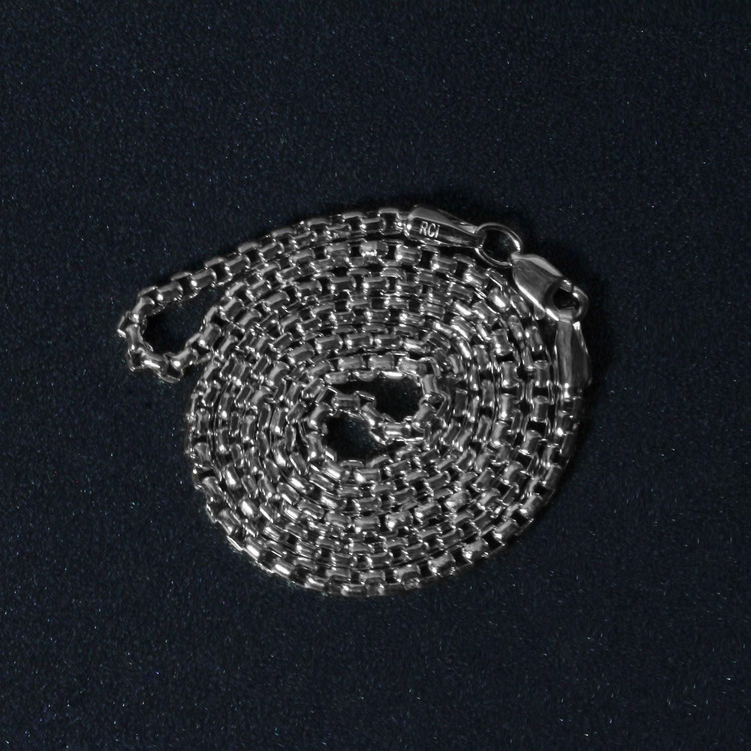 This round box chain comes in 14k white gold and has a width of 2.5 millimeters.