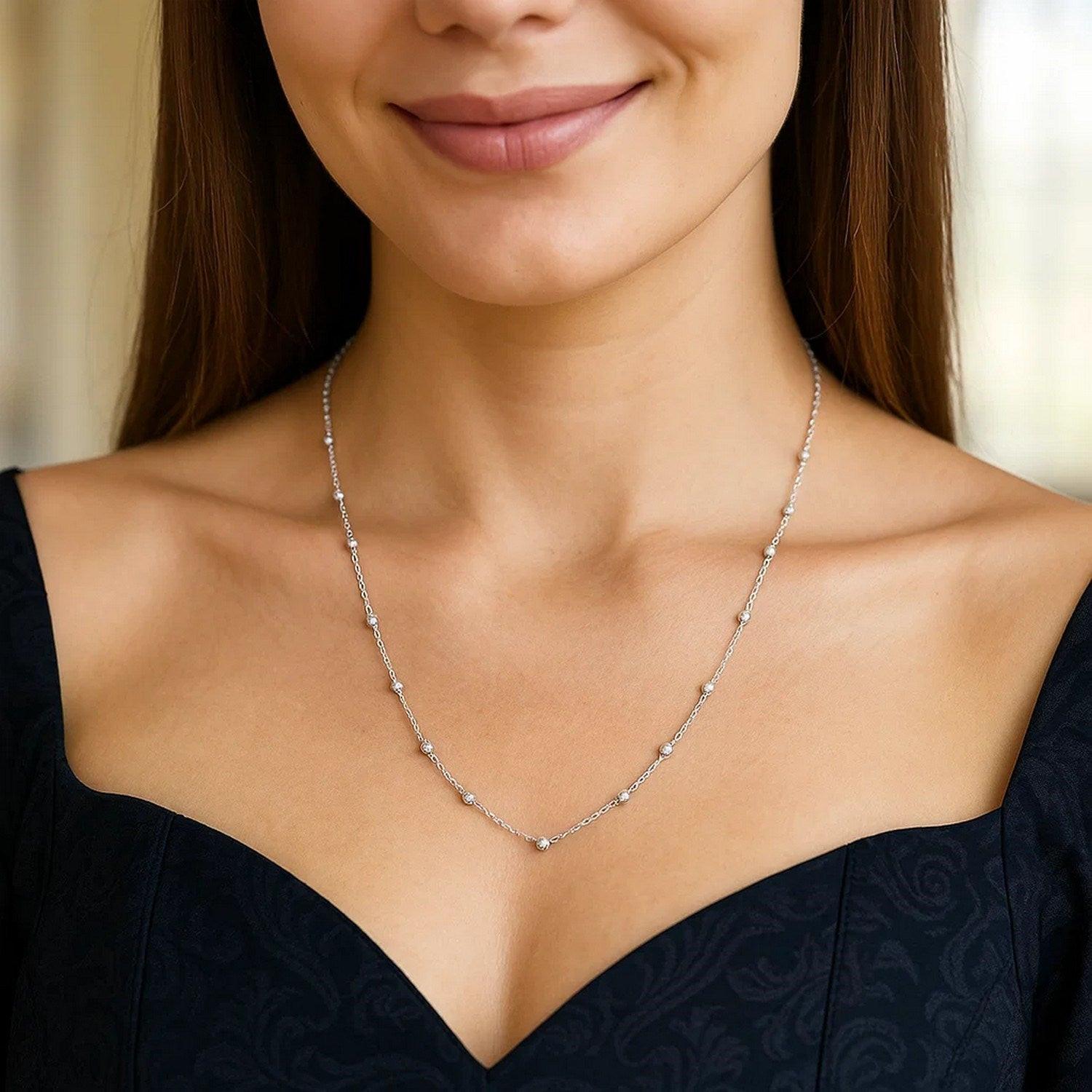 This 14K white gold Saturn bead chain necklace features evenly spaced polished beads along a sleek, shimmering chain. Its modern yet delicate design makes it perfect for everyday wear, layering, or adding a touch of refined sparkle to any look.