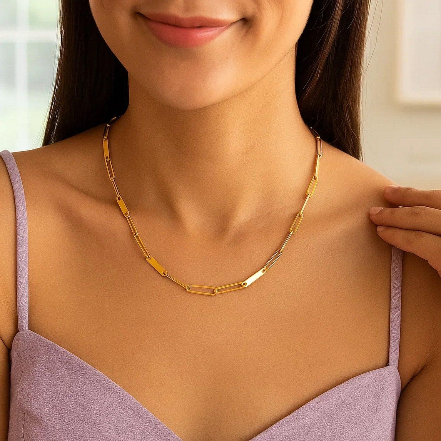 Shiny gold bars beautifully punctuate this stunning chain of 14k yellow gold paperclip chain links. Necklace is 18 inches long.