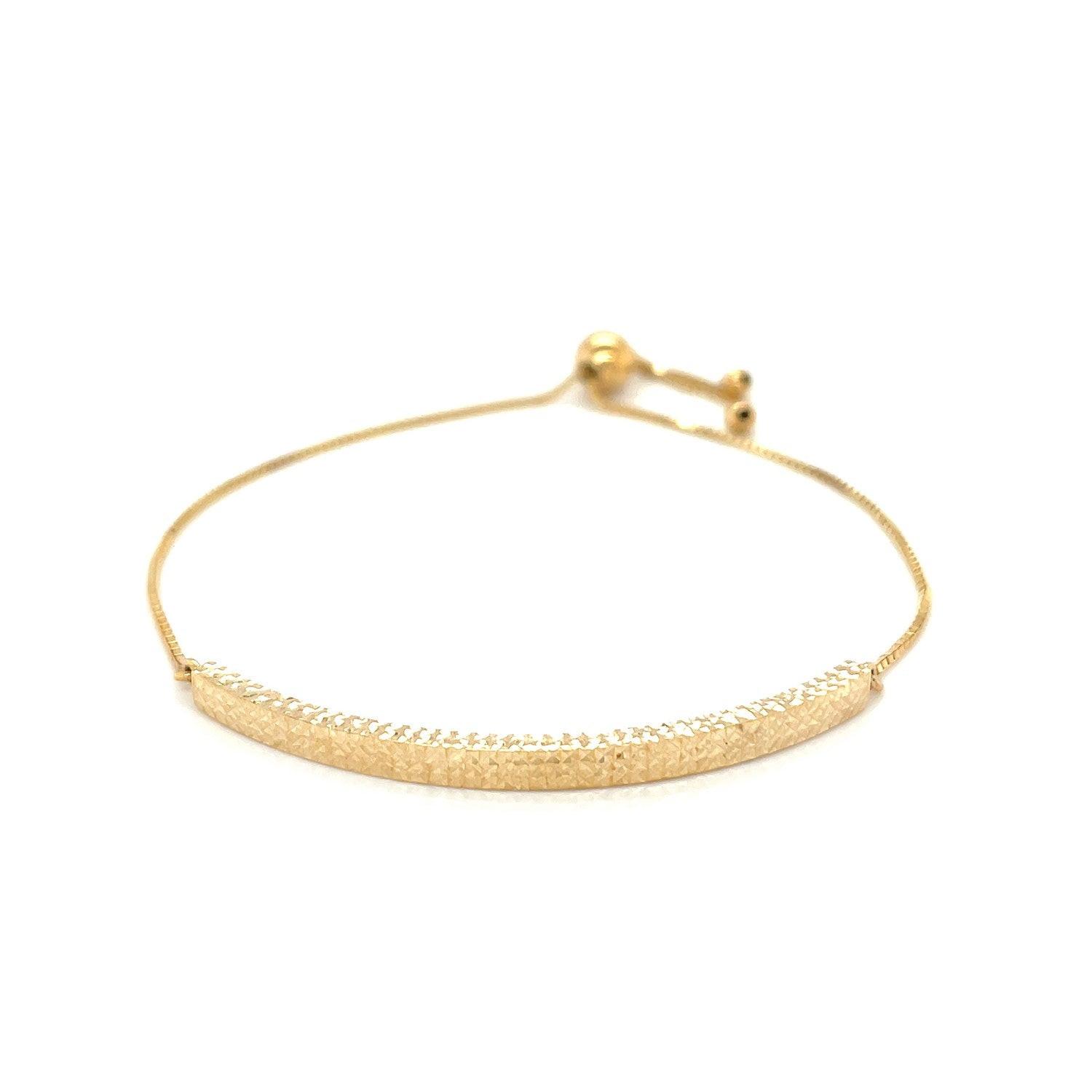 Featuring a uniquely beautiful adjustable lariat drawstring closure, this bracelet showcases a diamond cut curved bar. Made of 14k yellow gold.