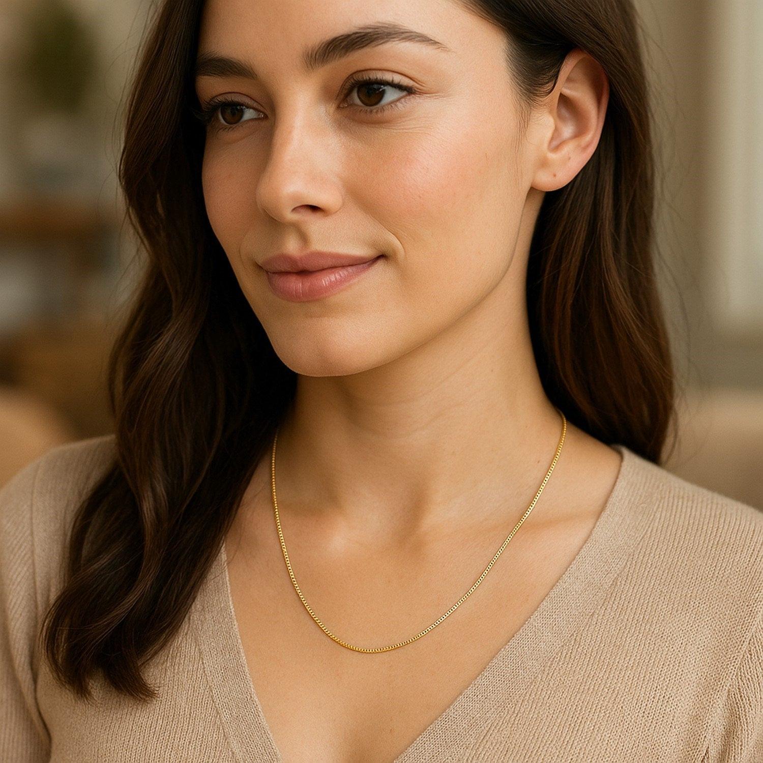 This classic box chain comes in 14k yellow gold and has a width of 0.45 millimeters.