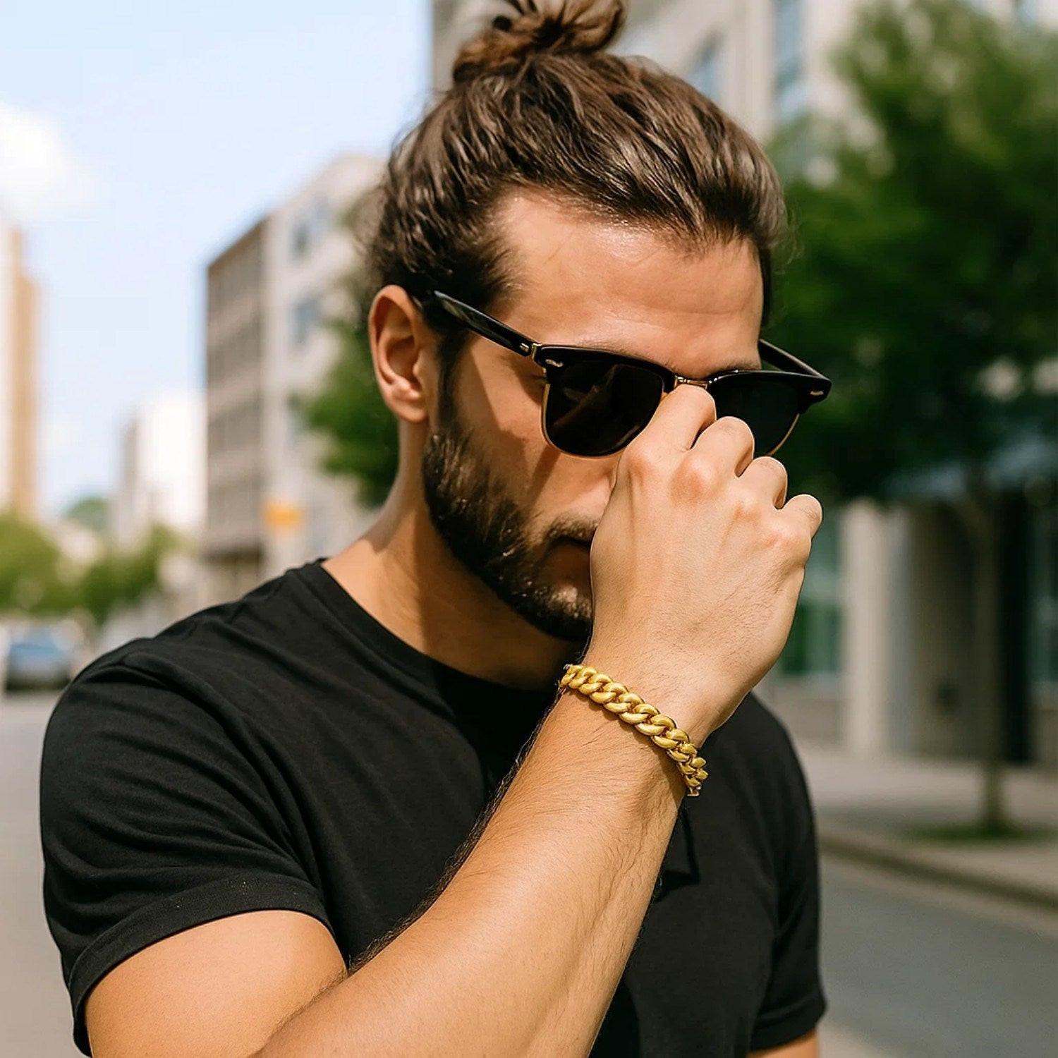 This Classic Miami Cuban solid bracelet comes in 14k yellow gold and has a width of 8.25 millimeters. Secured with a box clasp.