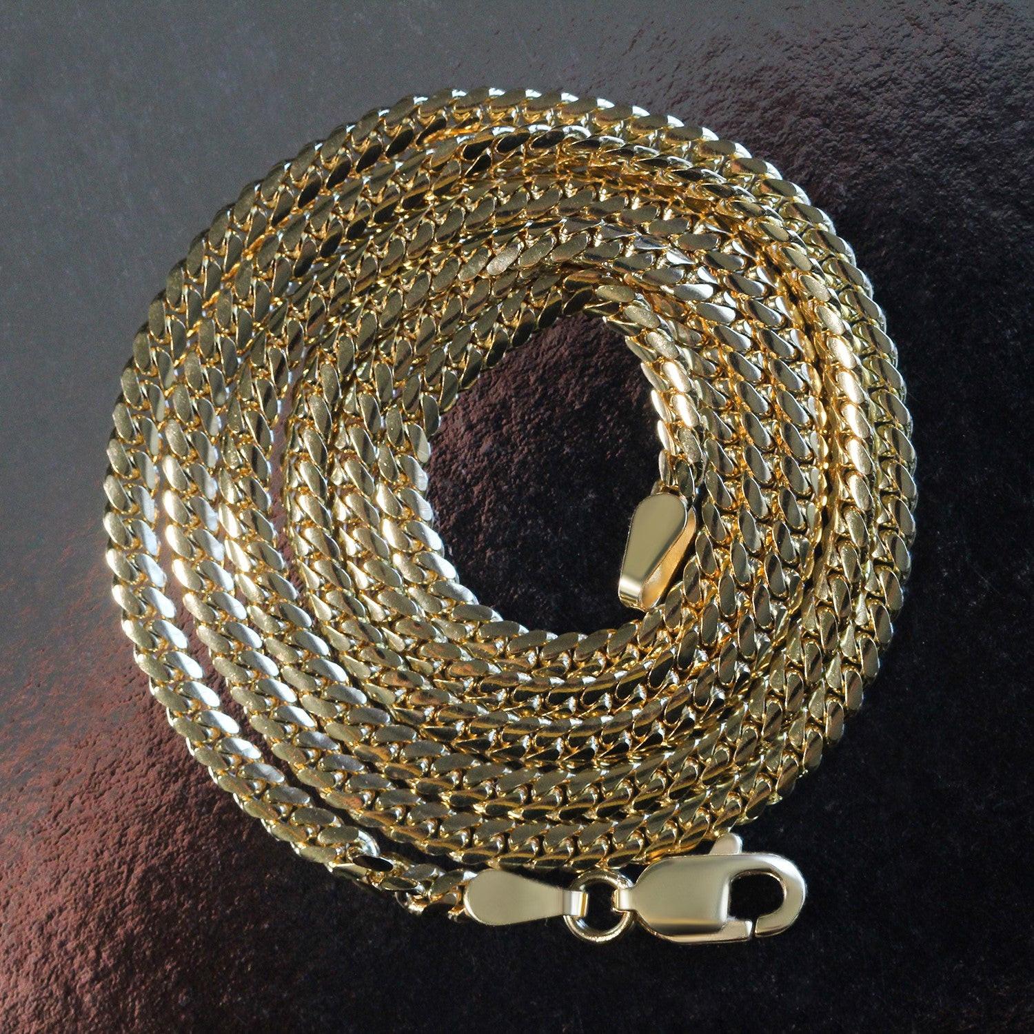 This classic solid Miami Cuban chain comes in 14k yellow gold and has a width of 2.60 millimeters.