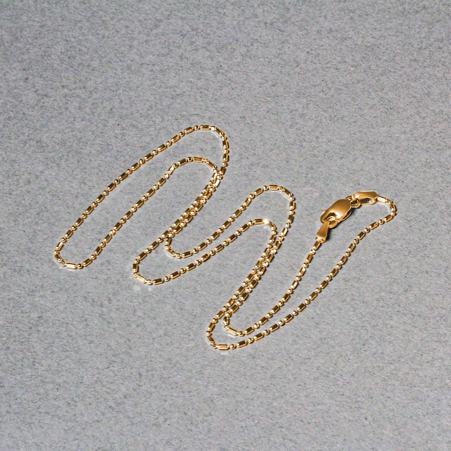 This diamond cut bead chain comes in 14k yellow gold and has a width of 0.90 millimeters.