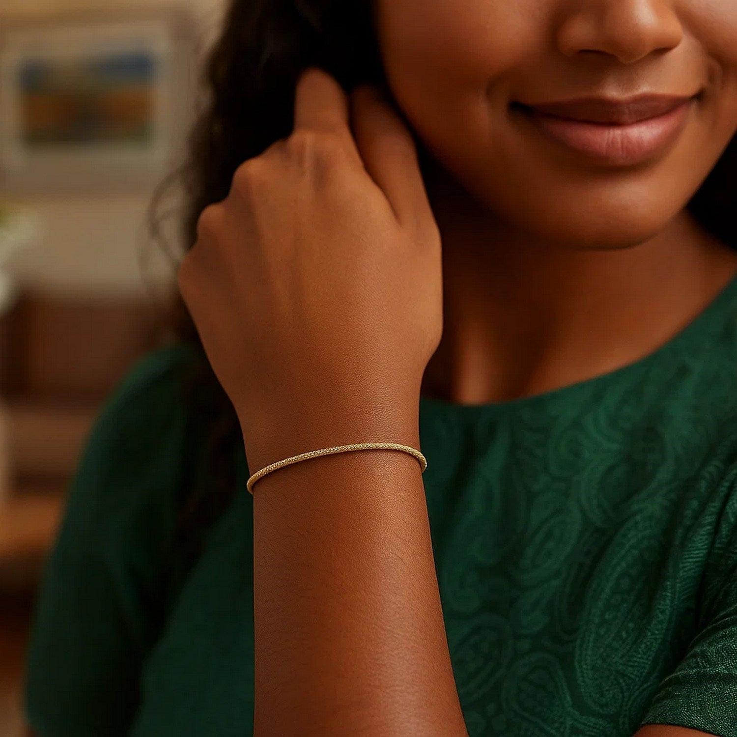 Crafted in luminous 14K yellow gold, this 1.70 mm diamond-cut sparkle spring bracelet features intricately faceted links that shimmer with every movement, offering a delicate yet eye-catching shine. Lightweight, flexible, and effortlessly elegant, it’s the perfect everyday piece for adding a touch of refined brilliance to any jewelry stack.