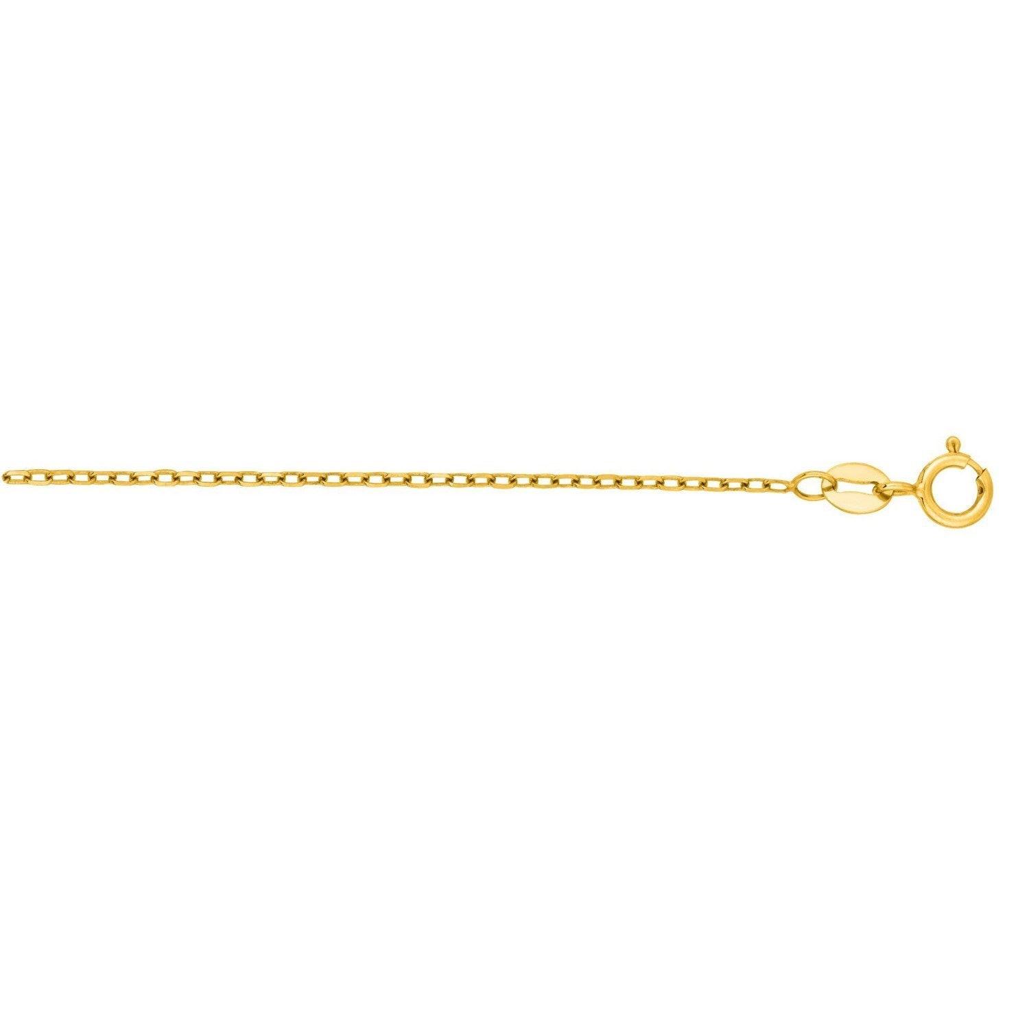 This faceted cable link chain comes in 14k yellow gold and has a width of 1.2 millimeters.