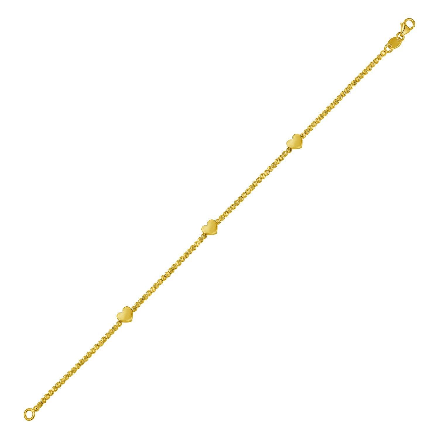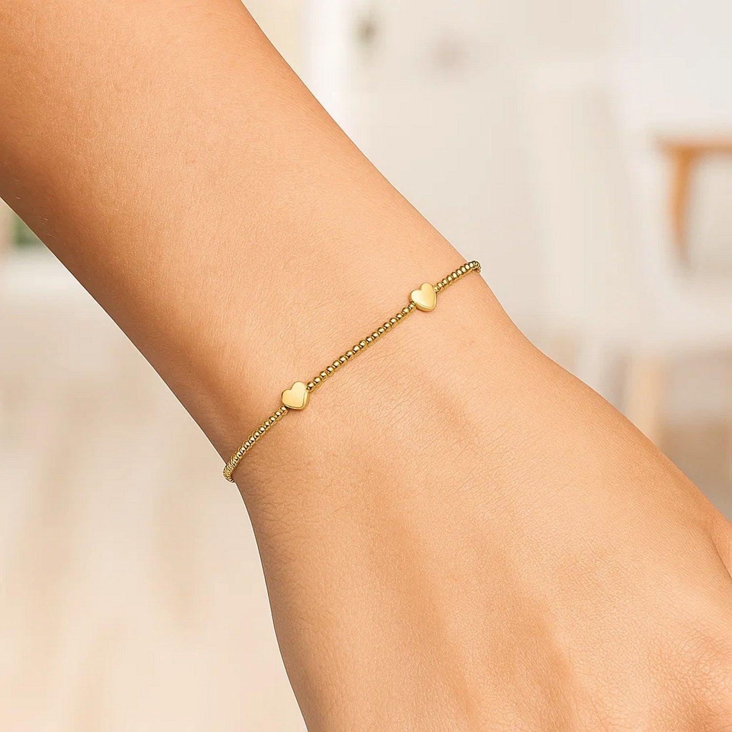 Elevate your elegance with this 14K yellow gold bracelet, featuring beads and heart stations. Measuring 7 inches in length, it offers a comfortable fit secured by a reliable lobster clasp. The intricate design and warm gold hue make it a versatile accessory, perfect for both everyday wear and special occasions. Expertly crafted for lasting beauty, this bracelet is a timeless addition to any jewelry collection.
