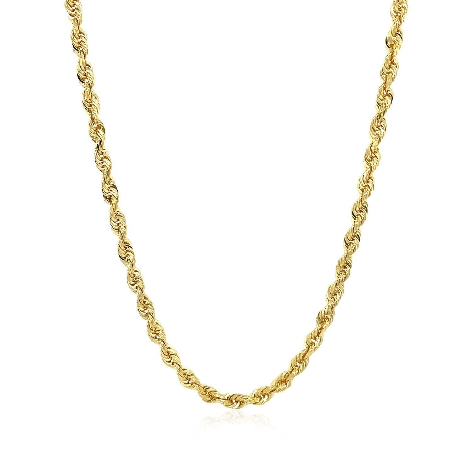 This hollow diamond cut rope chain comes in 14K yellow gold and has a width of 3.2 mm.