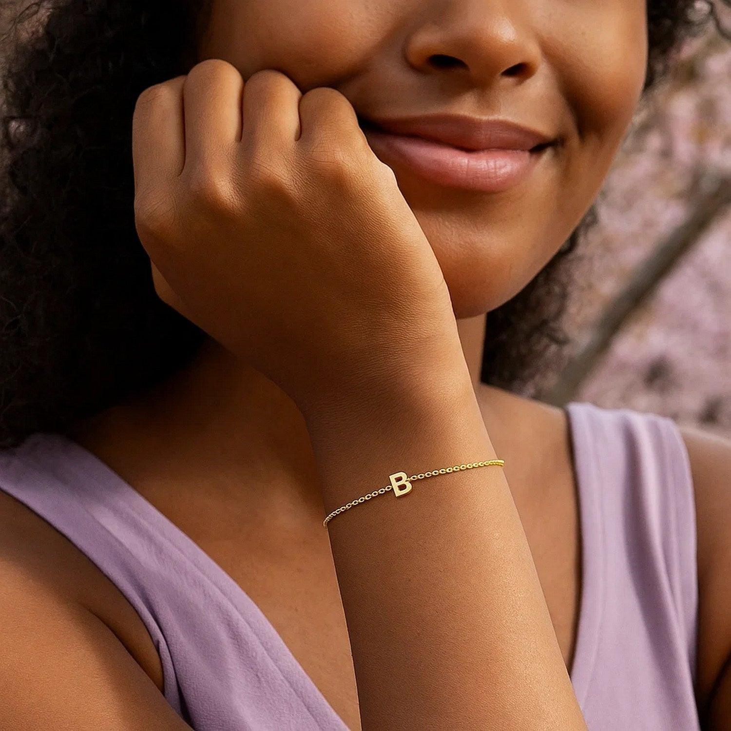 Crafted in radiant 14K yellow gold, this mini initial B bracelet features a petite, polished letter charm centered on a delicate chain, creating a timeless and personal accent. Its minimalist design and warm golden glow make it perfect for everyday wear, beautiful on its own for subtle elegance or layered with other favorites to create a meaningful, customized bracelet stack.