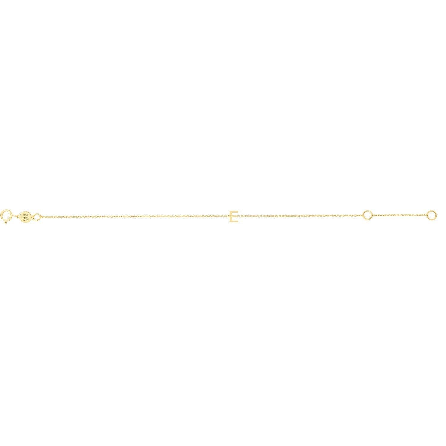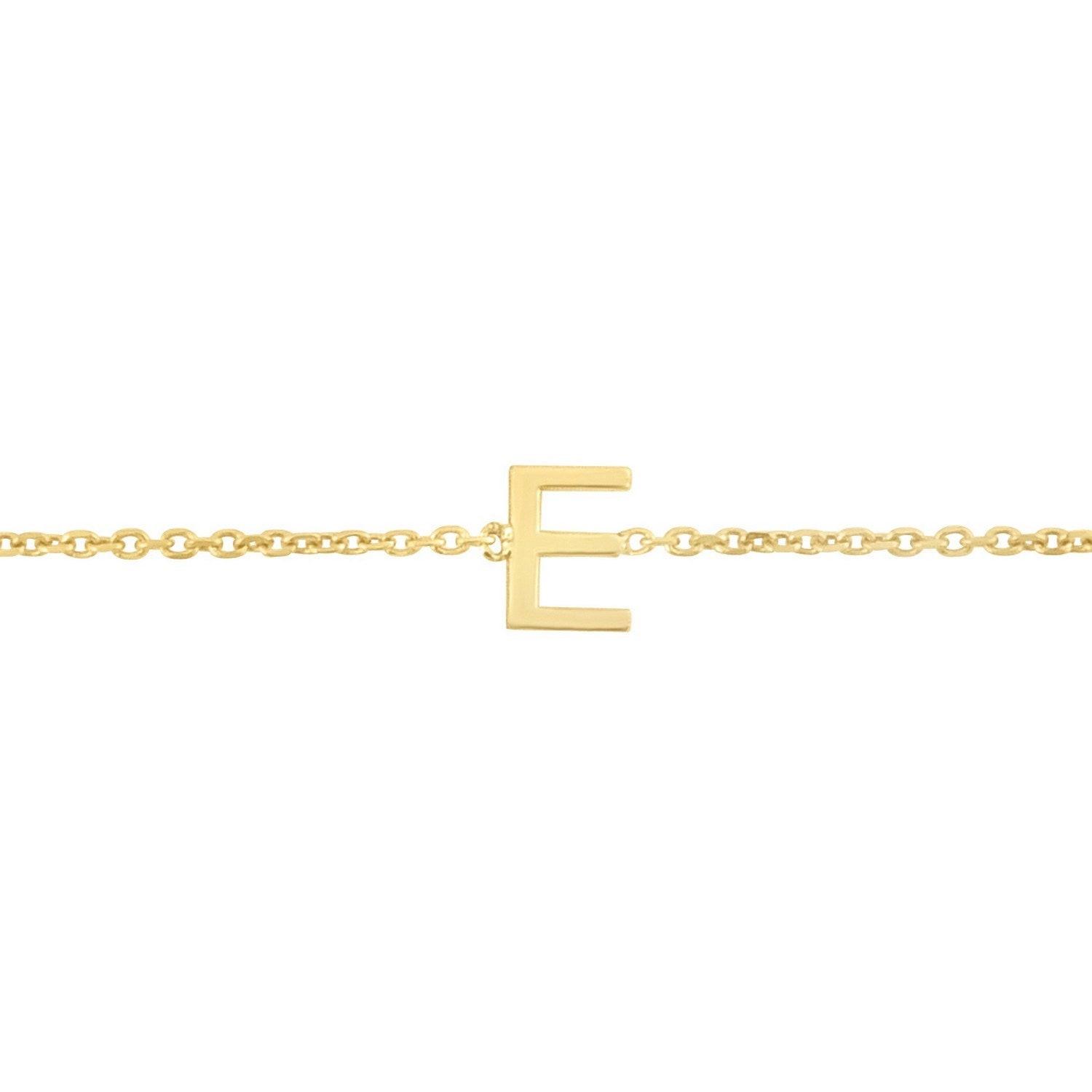 This 14K yellow gold mini initial E bracelet features a dainty polished letter charm on a delicate chain, offering a simple and meaningful touch. Perfect for everyday wear, gifting, or layering with other favorites.