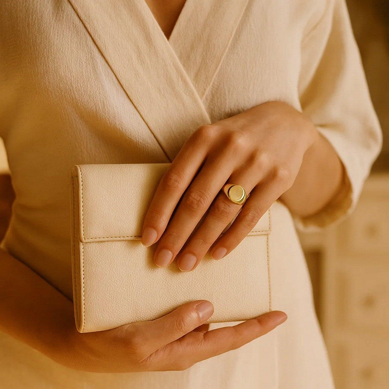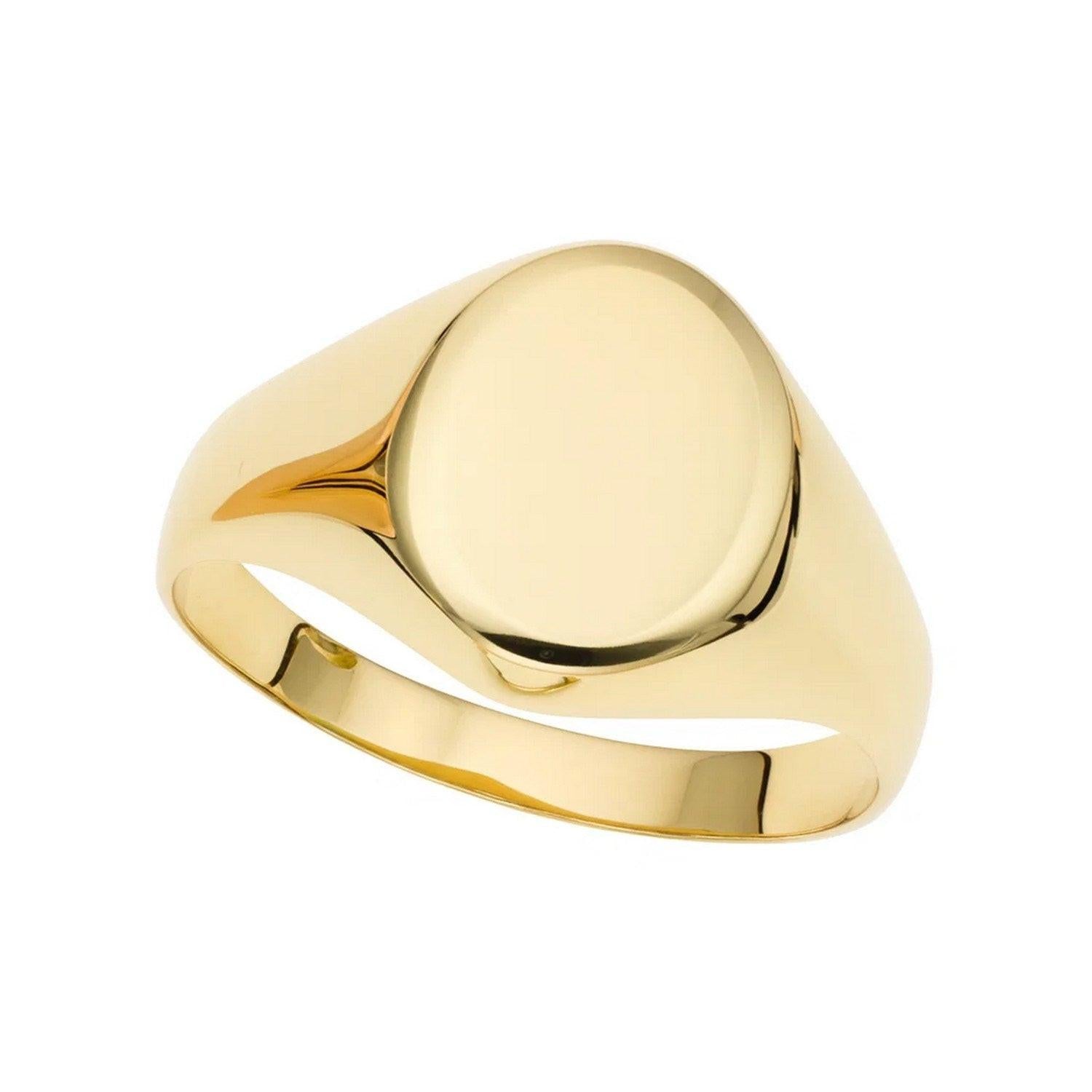 14K Yellow Gold Oval Satin Signet Ring crafted in solid 14K yellow gold with a satin-finished oval top. The smooth, tapered band offers a classic, refined look ideal for everyday wear or personal engraving.