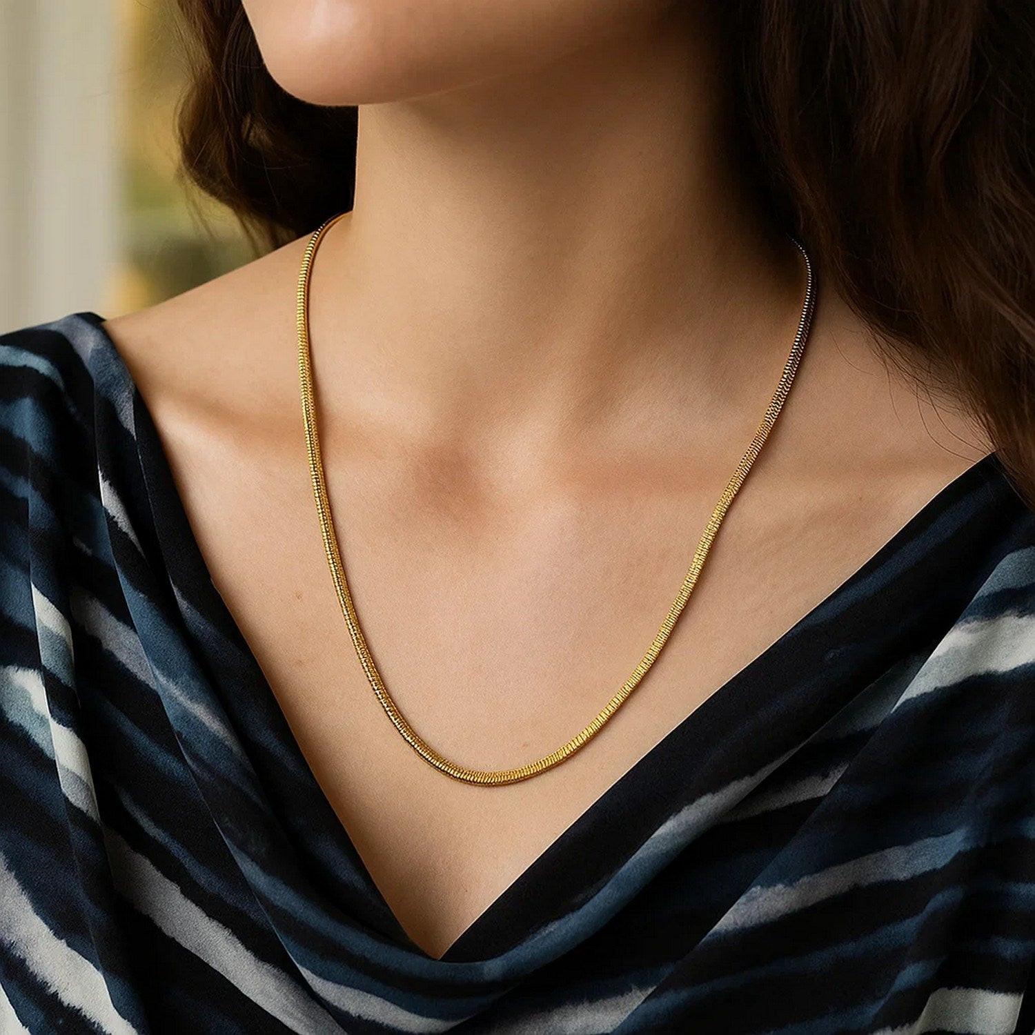 Crafted in 14K yellow gold, this oval snake chain features a 3.30 mm width with a smooth, rounded surface that offers a sleek and elegant appearance. Its flexible structure ensures comfortable wear, whether styled alone or with a pendant. Finished with a secure lobster clasp and available in lengths measuring 16 inches, 18 inches, and 20 inches to suit your personal style.