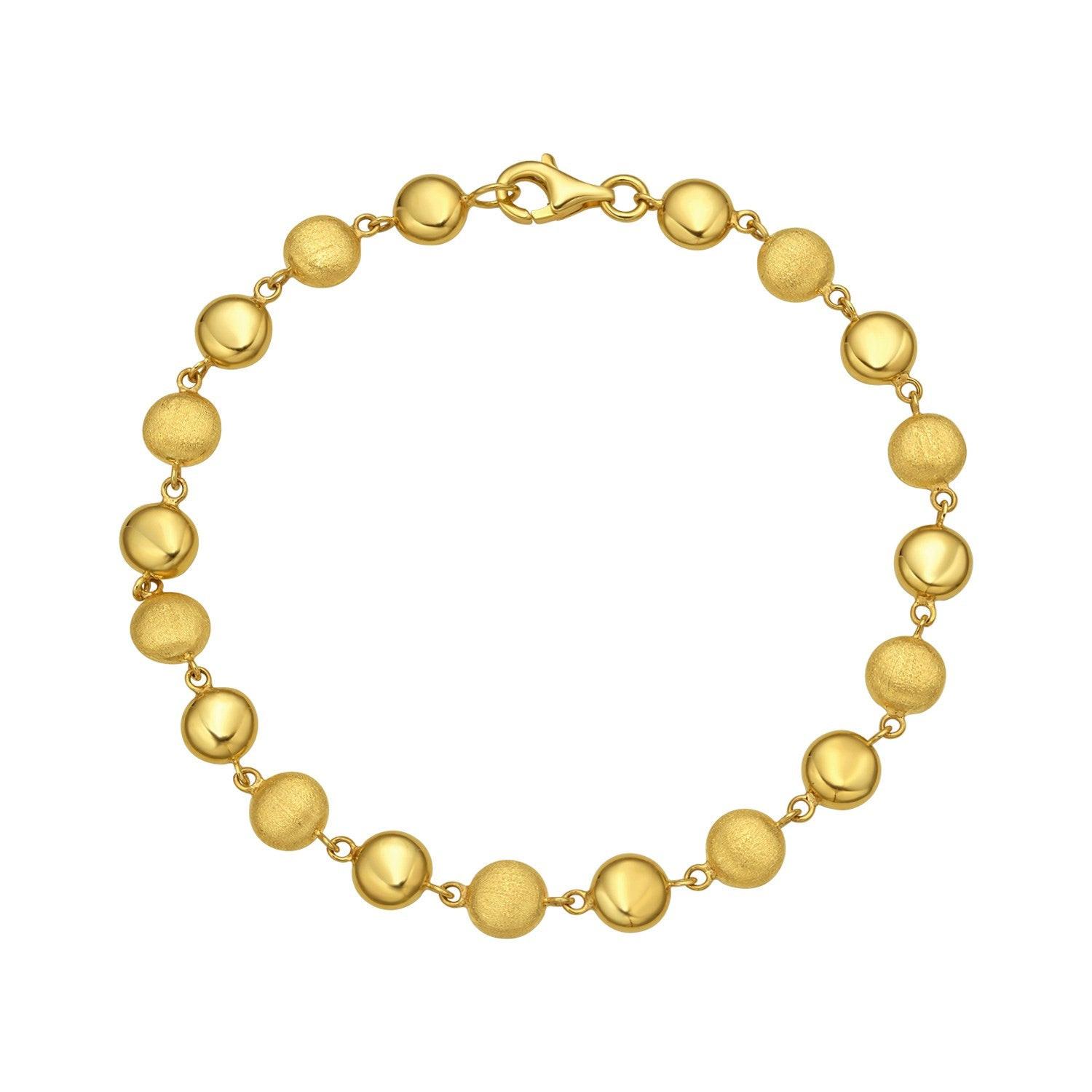 Elevate your elegance with this 14K yellow gold bracelet, featuring alternating polished and satin-finish pebble beads. Measuring 7 1/4 inches in length, it offers a comfortable fit secured by a pear-shaped lobster clasp. The unique combination of textures adds a sophisticated touch, making it perfect for both everyday wear and special occasions. Expertly crafted for lasting beauty, this bracelet is a timeless addition to any jewelry collection.