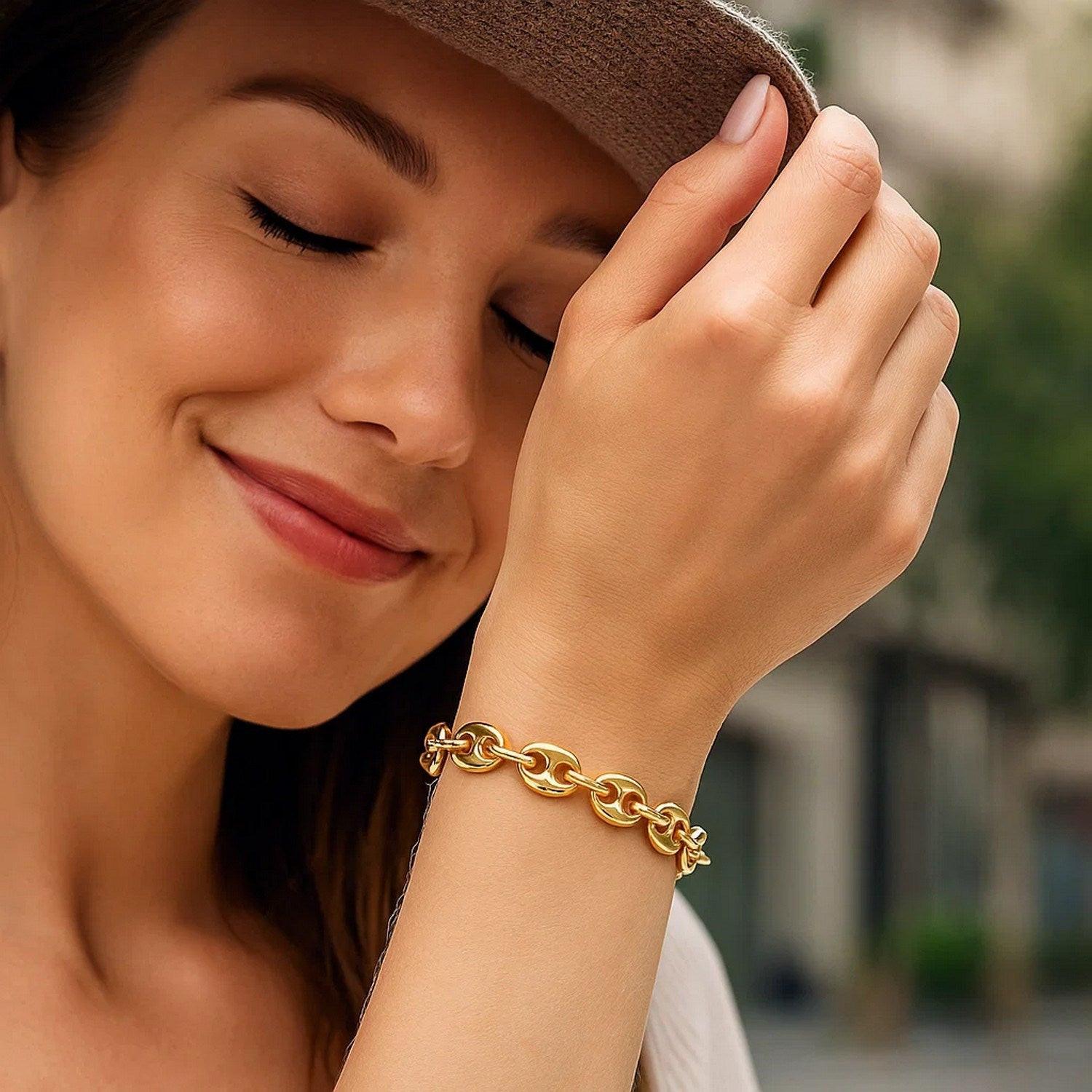This puffed mariner link bracelet comes in 14k yellow gold and has a width of 6.9 millimeters. Secured with a lobster clasp.