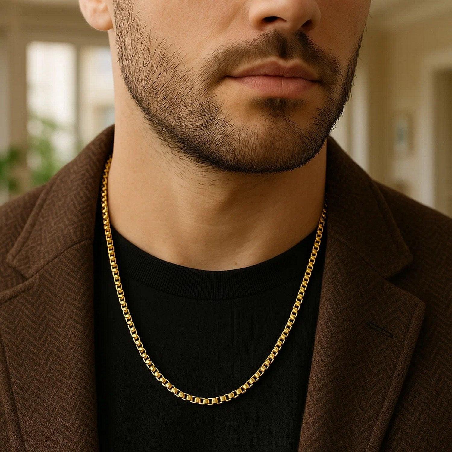 This round box chain comes in 14k yellow gold and has a width of 3.4 millimeters.