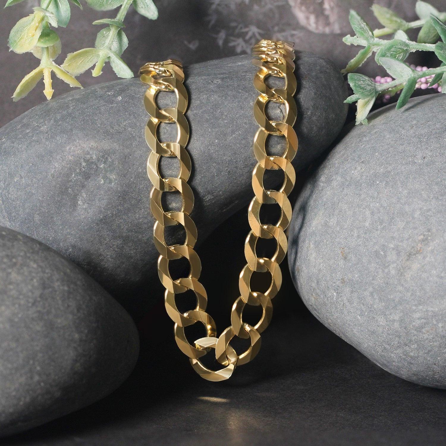 This solid curb chain comes in 14k yellow gold and has a width of 10.00 millimeters.