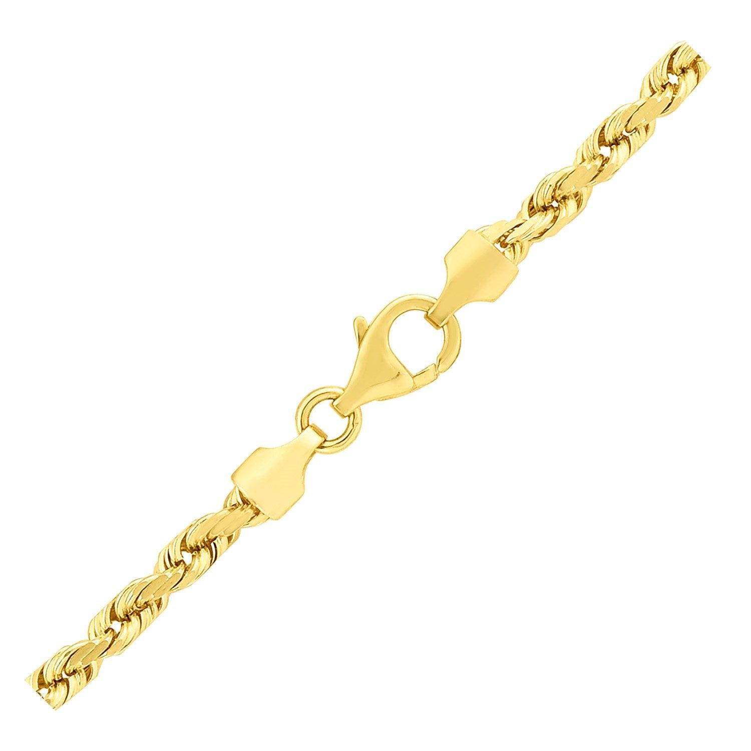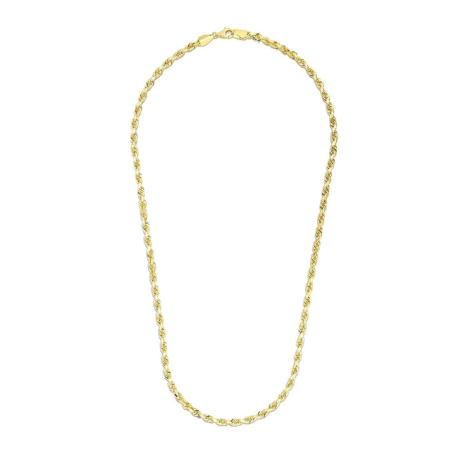 This solid diamond cut rope chain comes in 14k yellow gold and has a width of 3.5 millimeters.