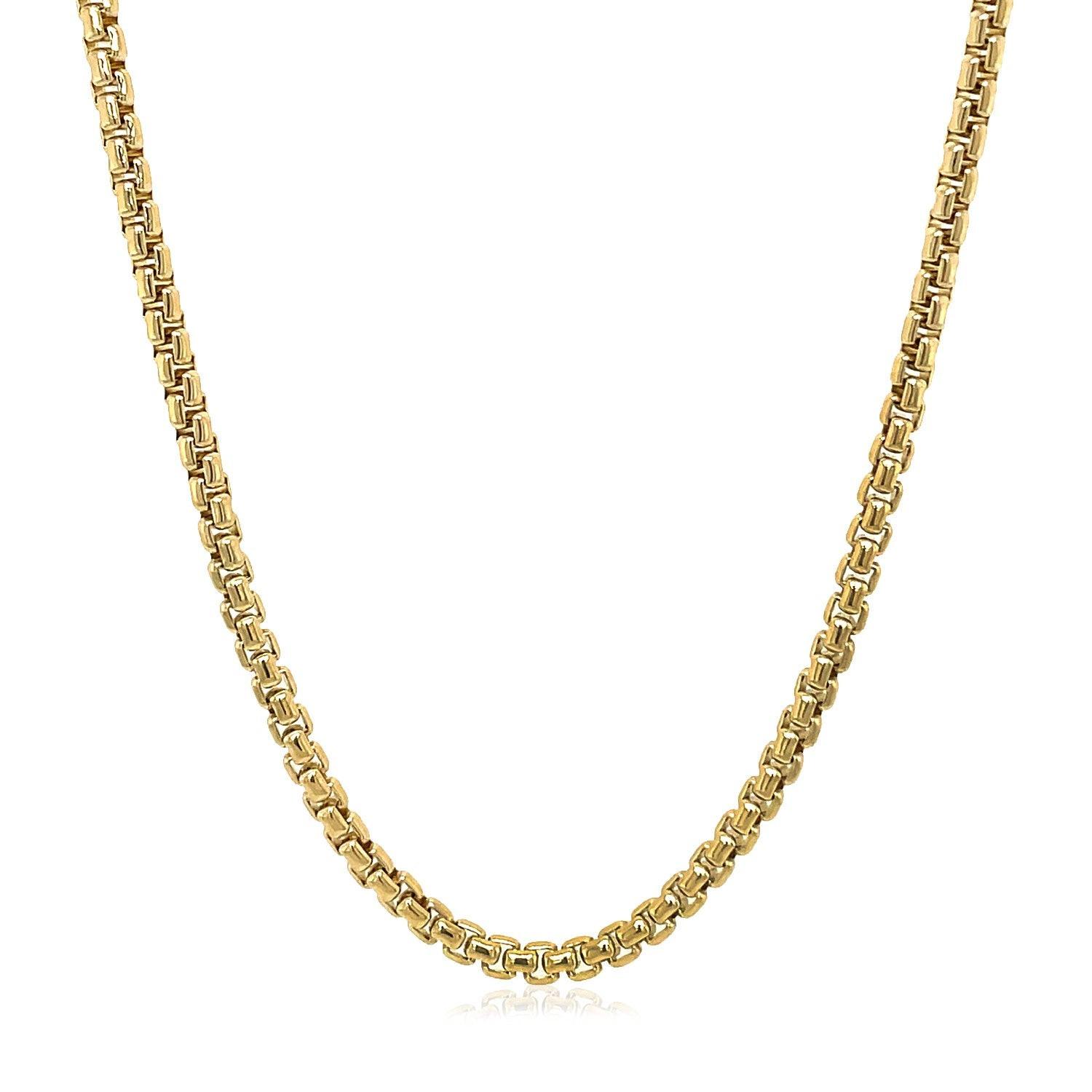 This round box chain comes in 14k yellow gold and has a width of 2.5 millimeters.