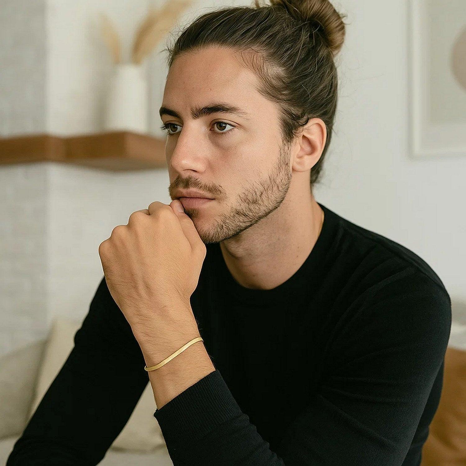 This super flex herringbone bracelet comes in 14k yellow gold and has a width of 1.5 millimeters. Secured with a lobster clasp.