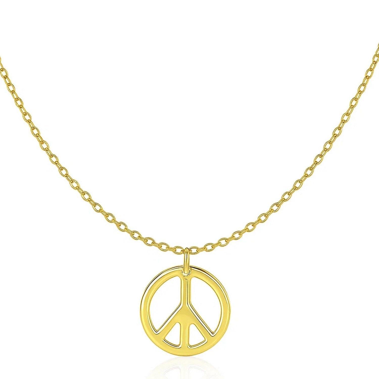 A classic, shiny gold symbol of Peace adorns a simple gold chain. The pendant is 17 inches long and closes with a spring ring clasp.