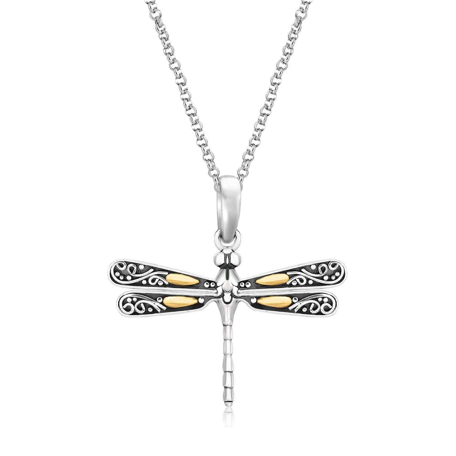 The simple bail provides a beautiful contrast to the exquisitely designed dragonfly with 18k yellow gold and scrollwork wings of this pendant. Crafted in fine sterling silver.