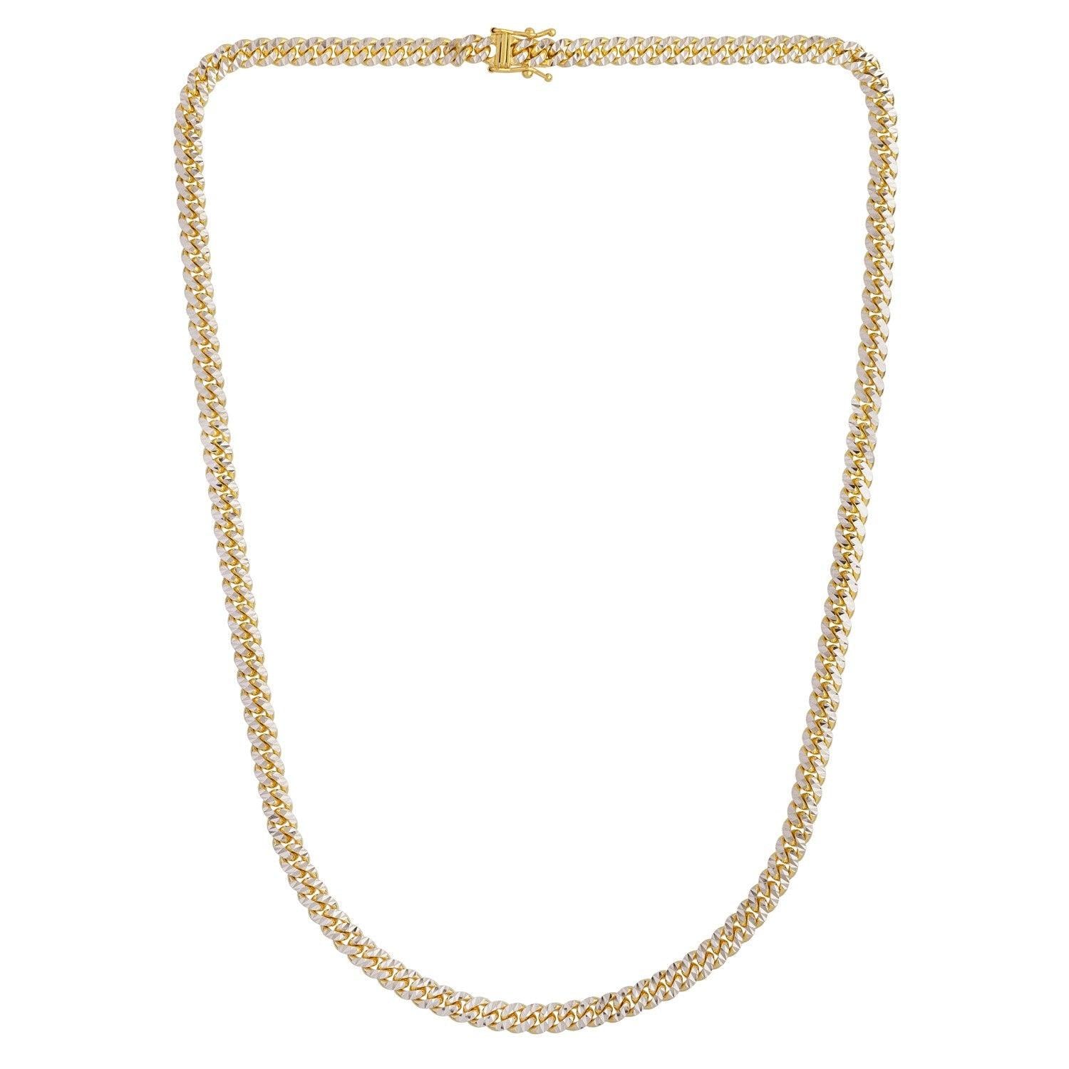 Classic Miami cuban white pave solid chain crafted in 14k yellow gold measuring 5 millimeters in width. Available in lengths 20 inches, 22 inches and 24 inches.