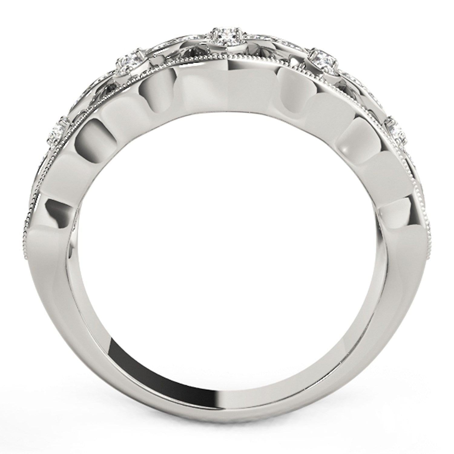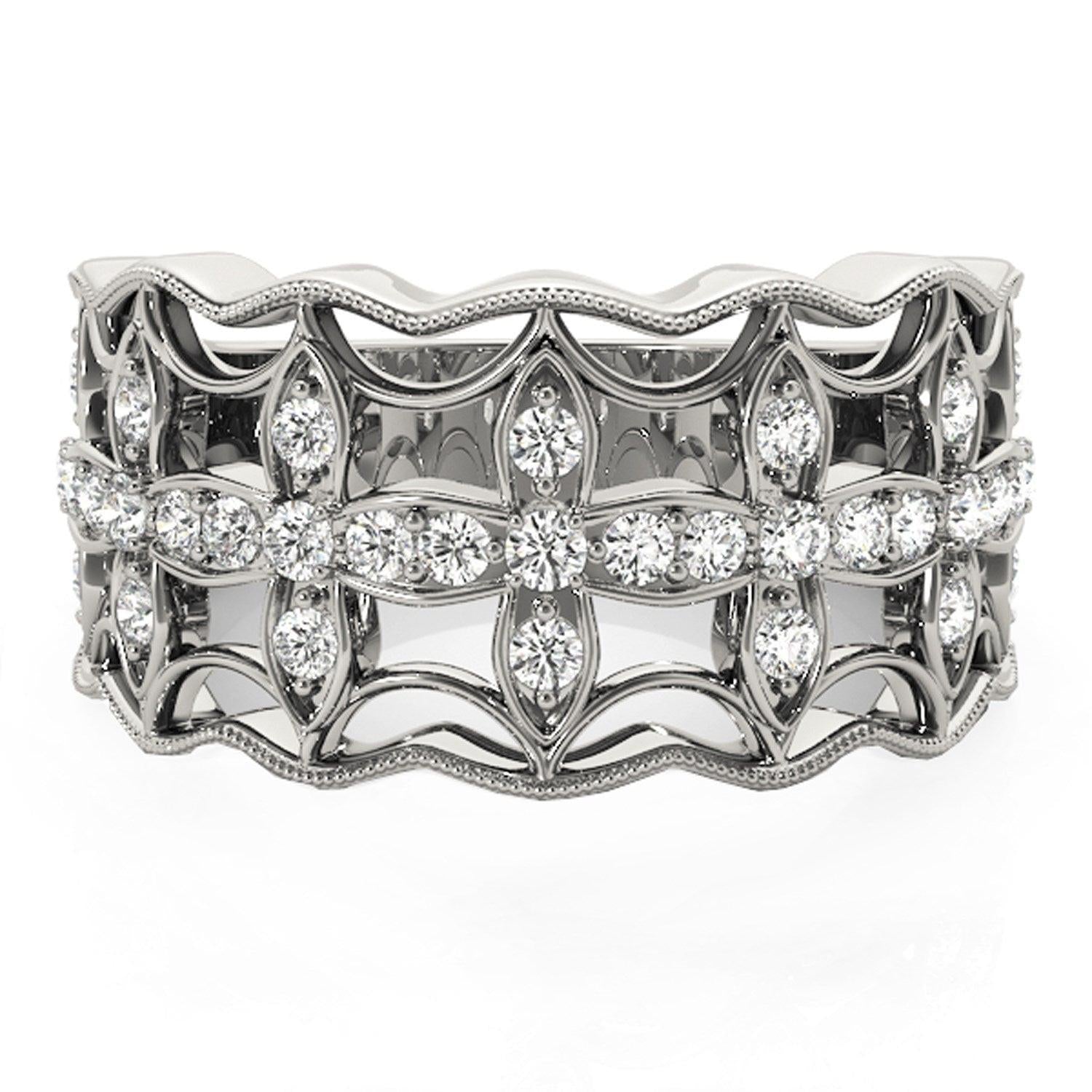 This unique ring features waves of shine surrounding four-leaf clover shapes with diamonds in 14k white gold.