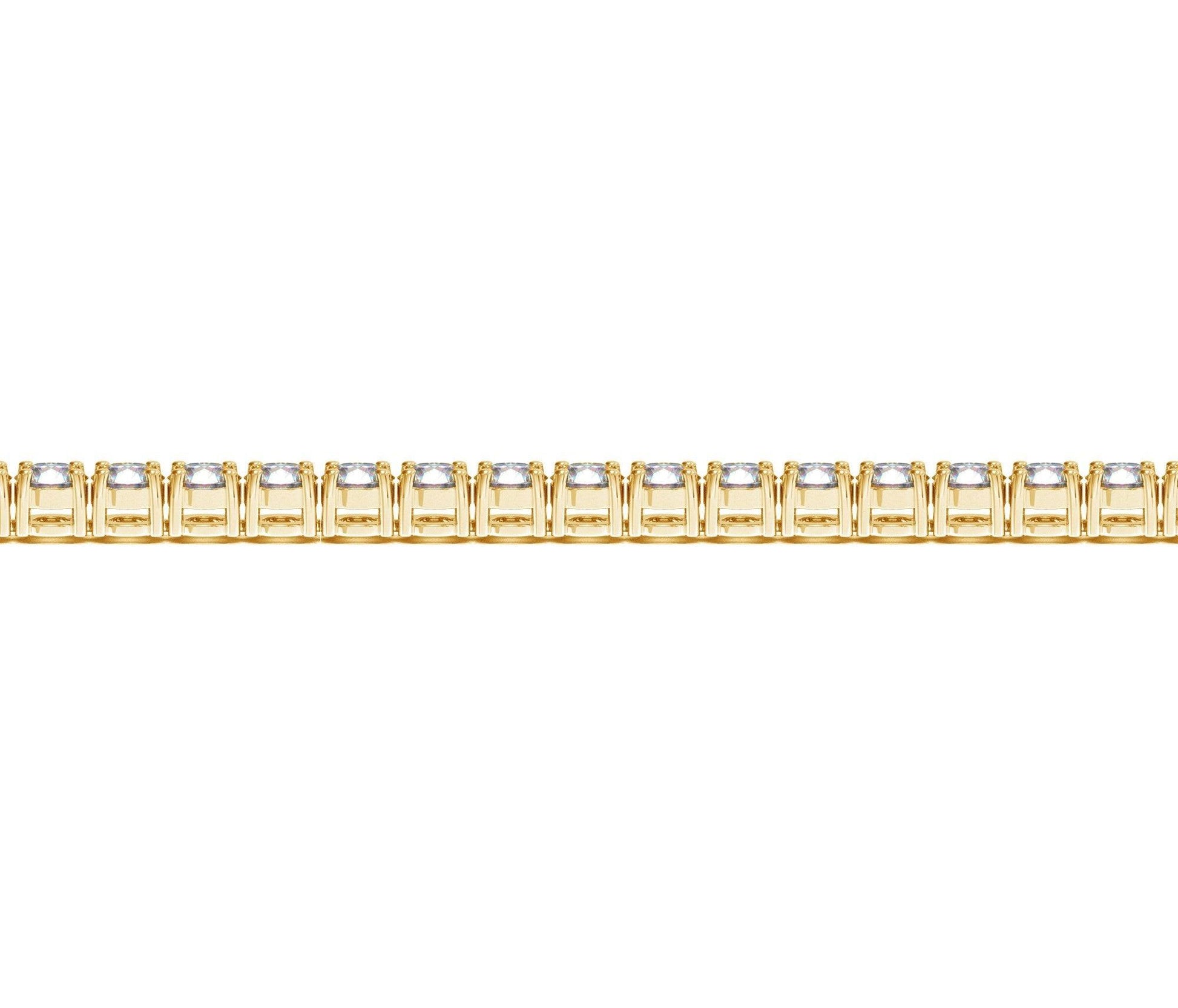 Classic four prong 10 carat total weight diamond tennis bracelet showcasing perfectly matched brilliant round cut lab grown diamonds set in 14k yellow gold.
