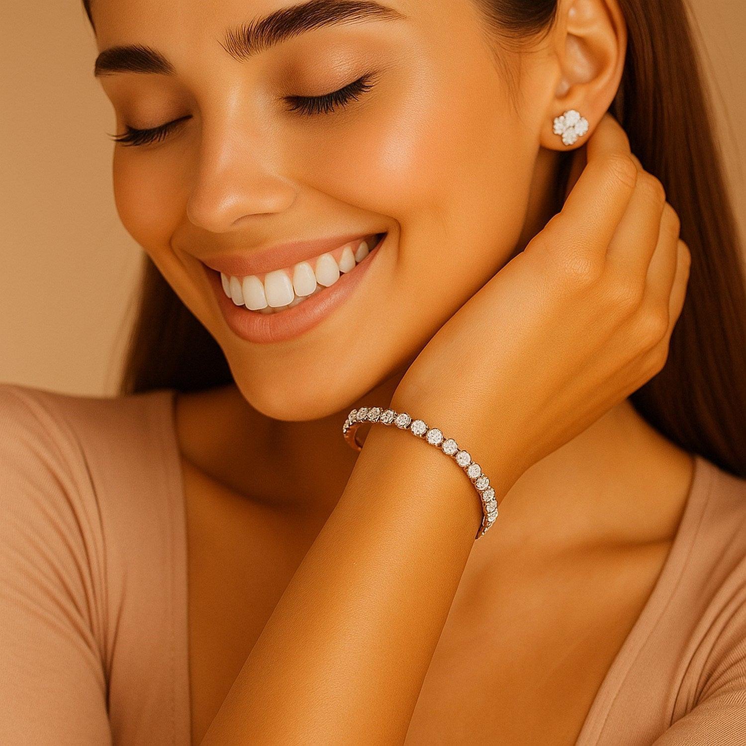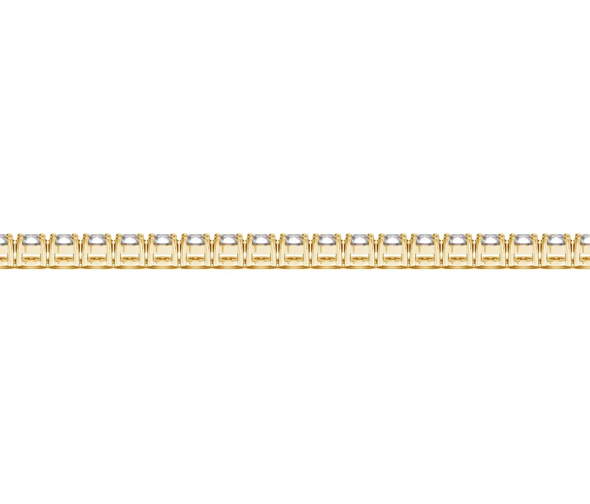 Classic four prong 5 carat total weight diamond tennis bracelet showcasing perfectly matched brilliant round cut lab grown diamonds set in 14k yellow gold.
