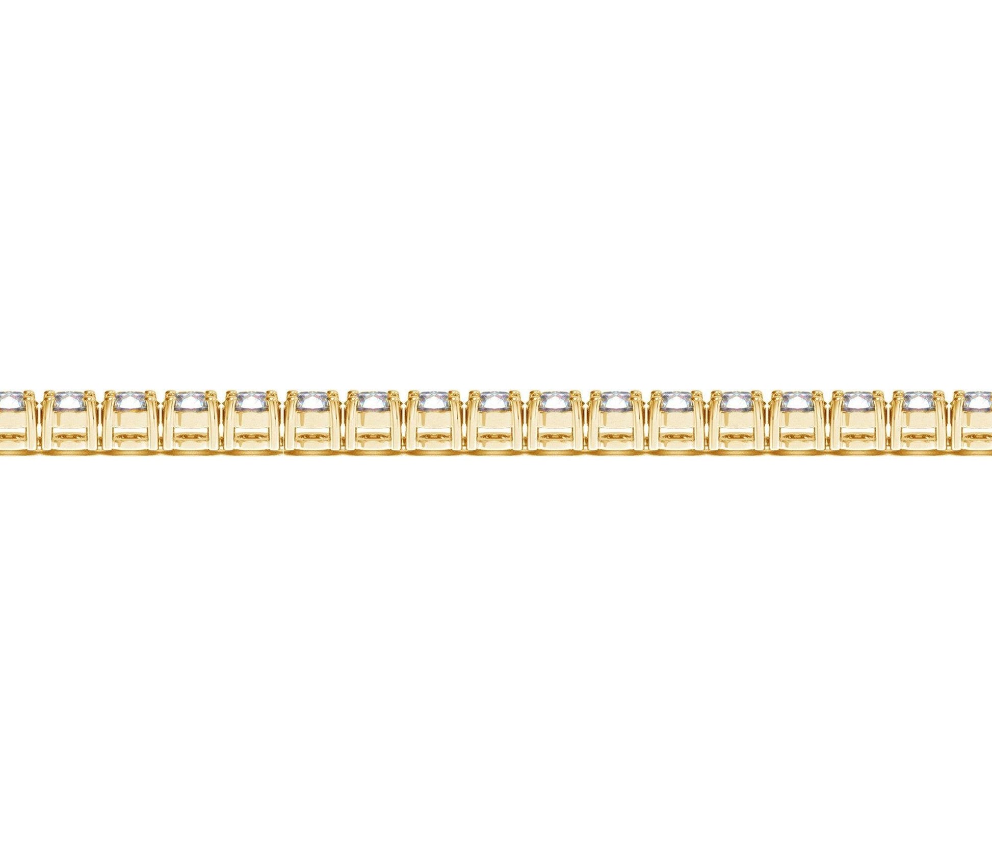 Classic four prong 6 carat total weight diamond tennis bracelet showcasing perfectly matched brilliant round cut lab grown diamonds set in 14k yellow gold.