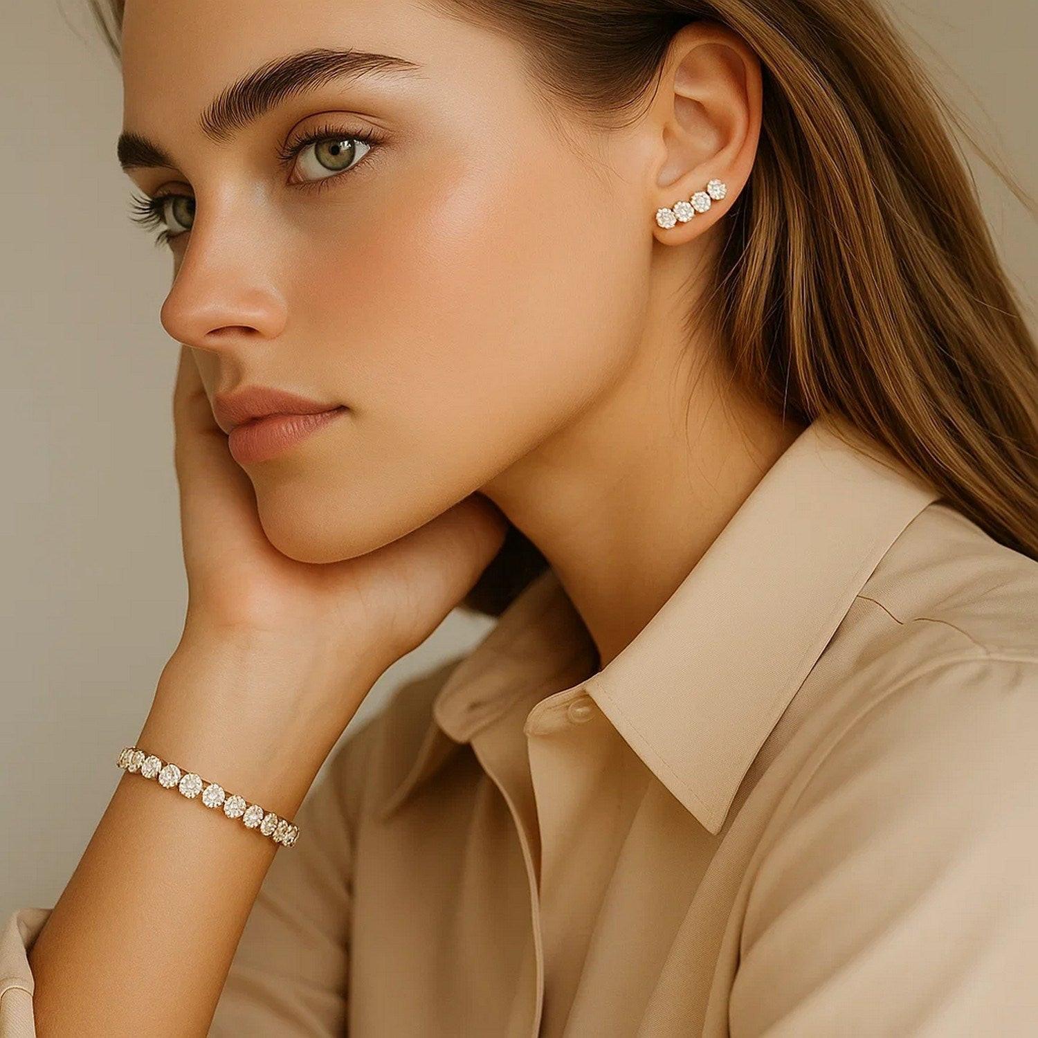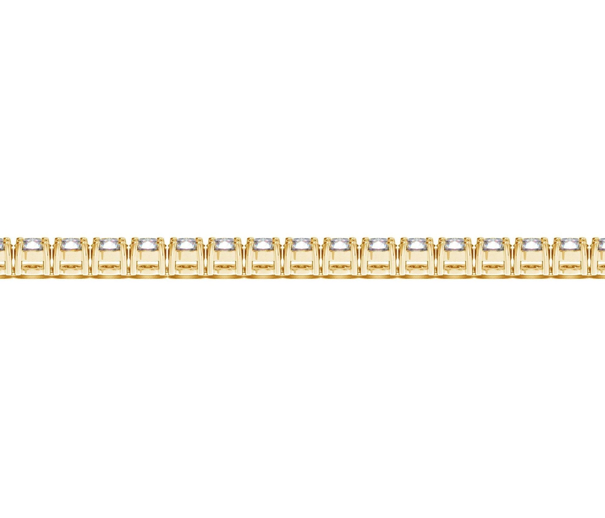 Classic four prong 7 carat total weight diamond tennis bracelet showcasing perfectly matched brilliant round cut lab grown diamonds set in 14k yellow gold.