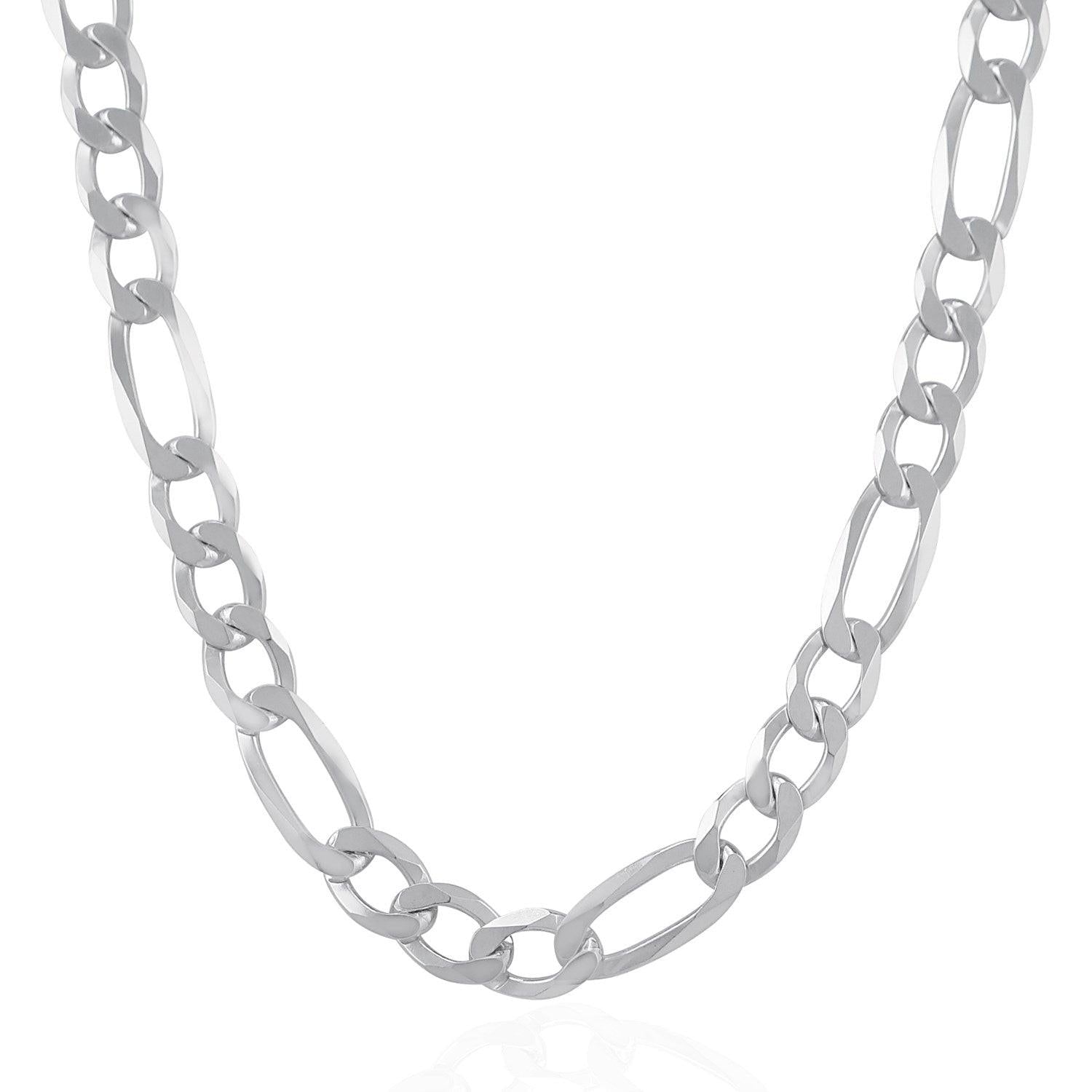 This classic rhodium plated chain is crafted in gleaming sterling silver and has a width of 8.80 millimeters. Featuring a Figaro chain design, it secured with a lobster clasp.